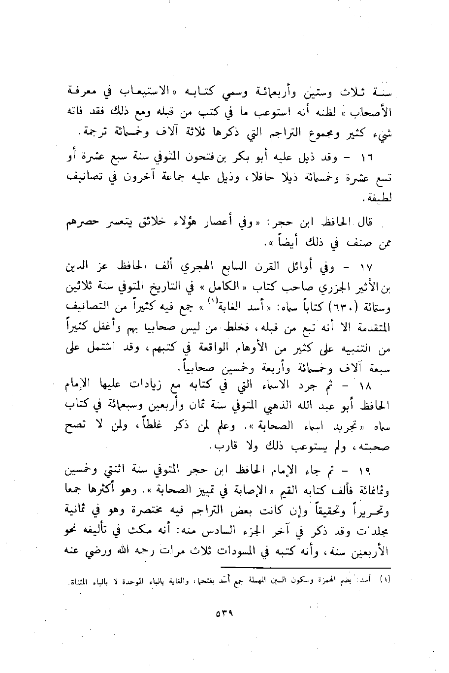 17- وفي أوائل القرن السابع الهجري ألف الحافظ عز الدين بن الأثير الجزري صاحب كتاب "الكامل" في التاريخ, المتوفى سنة ثلاثين وستمائة "630" كتابا سماه: "أسد الغابة"1 جمع فيه كثيرا من التصانيف المتقدمة إلا أنه تبع من قبله، فخلط من ليس صحابيا بهم, وأغفل كثيرا من التنبيه على كثير من الأوهام الواقعة في كتبهم، وقد اشتمل على سبعة آلاف وخمسمائة وأربعة وخمسين صحابيا.
