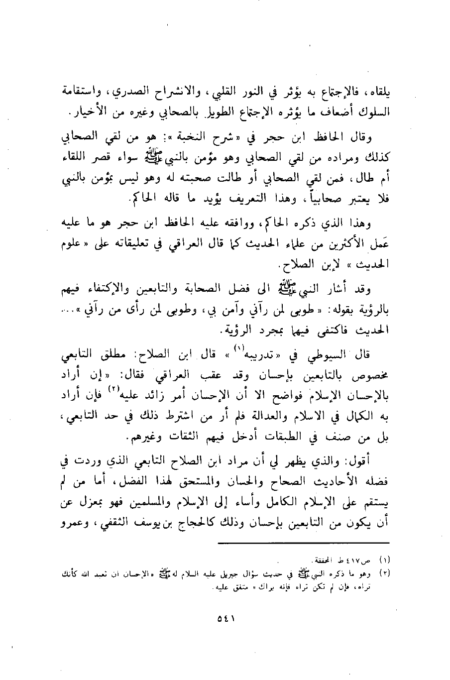 وقد أشار النبي -صلى الله عليه وسلم- إلى فضل الصحابة والتابعين والاكتفاء فيهم بالرؤية بقوله: "طوبى لمن رآني وآمن بي، وطوبى لمن رأى من رآني" ... الحديث فاكتفى فيهما بمجرد الرؤية.