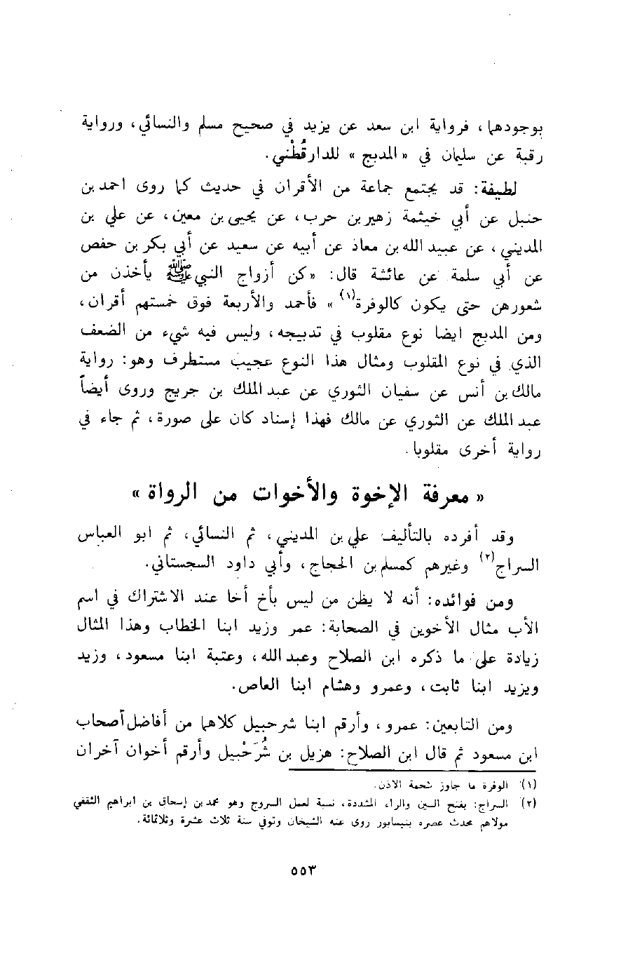لطيفة: قد يجتمع جماعة من الأقران في حديث كما روى أحمد بن حنبل عن أبي خيثمة زهير بن حرب، عن يحيى بن معين، عن علي بن المديني، عن عبيد الله بن معاذ عن أبيه عن سعيد عن أبي بكر بن حفص عن أبي سلمة عن عائشة قال: "كان أزواج النبي -صلى الله عليه وسلم- يأخذن من شعورهن حتى يكون كالوفرة"1 فأحمد والأربعة فوق خمستهم أقران، ومن المدبج أيضا نوع مقلوب في تدبيجه، وليس فيه شيء من الضعف الذي في نوع المقلوب, ومثال هذا النوع عجيب مستطرف وهو: رواية مالك بن أنس عن سفيان الثوري عن عبد الملك بن جريج وروى أيضا عبد الملك عن الثوري عن مالك, فهذا إسناد كان على صورة، ثم جاء في رواية أخرى مقلوبا.