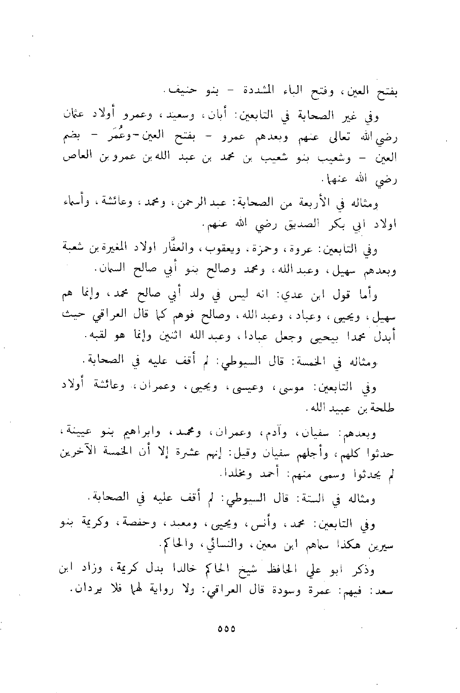 وفي غير الصحابة في التابعين: أبان، وسعيد، وعمرو أولاد عثمان رضي الله تعالى عنهم وبعدهم عمرو -بفتح العين- وعمر -بضم العين- وشعيب بنو شعيب بن محمد بن عبد الله بن عمرو بن العاص رضي الله عنهما.