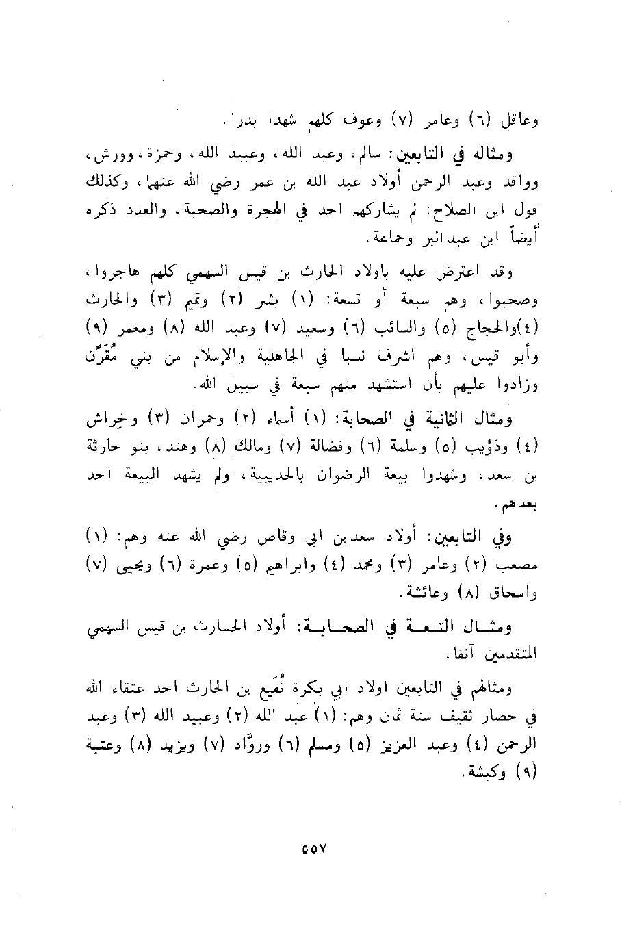 ومثاله في التابعين: سالم, وعبد الله، وعبيد الله، وحمزة، وورش، وواقد وعبد الرحمن أولاد عبد الله بن عمر رضي الله عنهما، وكذلك قول ابن الصلاح: لم يشاركهم أحد في الهجرة والصحبة، والعدد ذكره أيضا ابن عبد البر وجماعة.