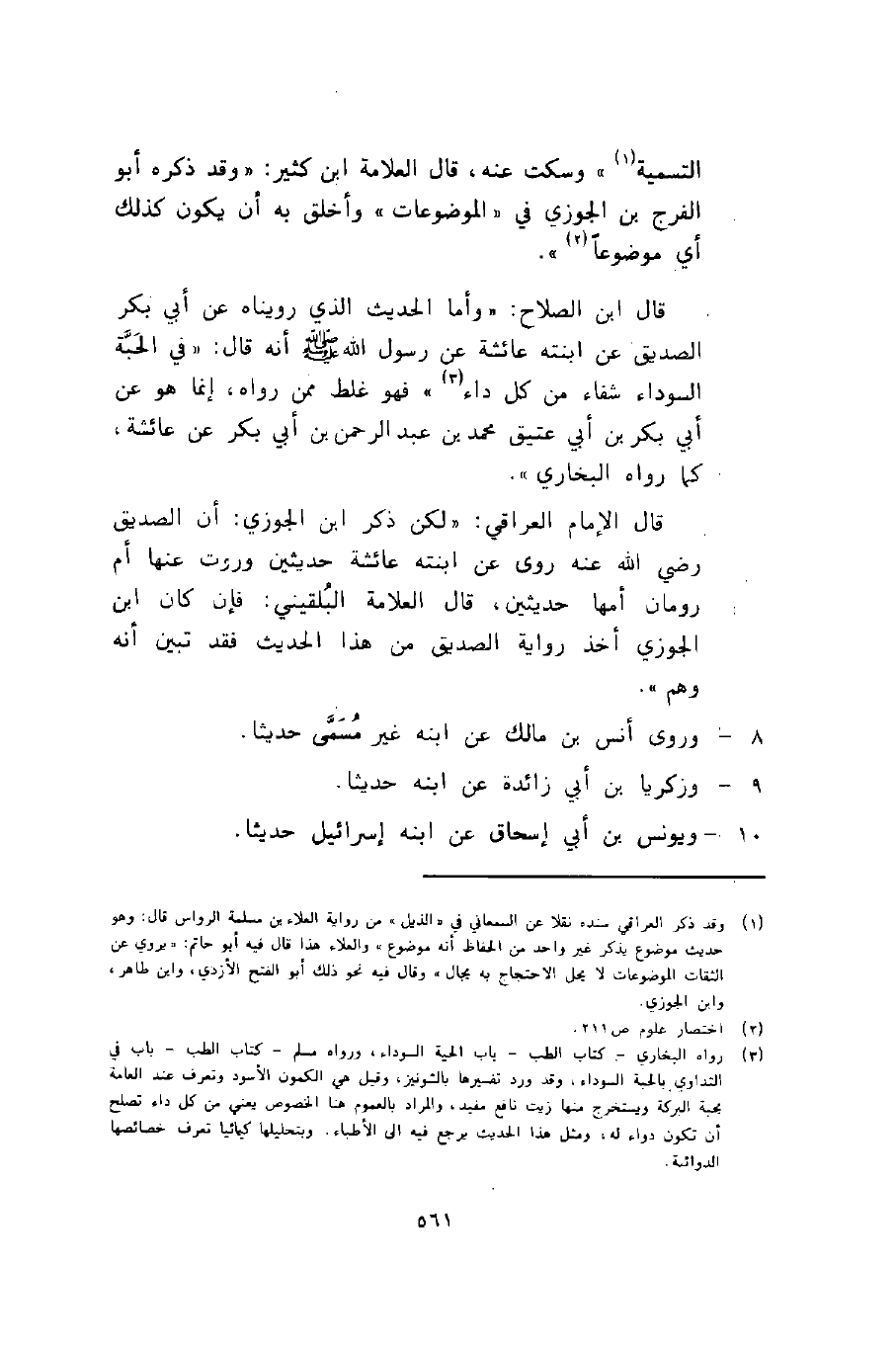 قال ابن الصلاح: "وأما الحديث الذي رويناه عن أبي بكر الصديق عن ابنته عائشة عن رسول الله -صلى الله عليه وسلم- أنه قال: "في الحبة السوداء شفاء من كل داء" 3, فهو غلط ممن رواه، إنما هو عن أبي بكر بن أبي عتيق محمد بن عبد الرحمن بن أبي بكر عن عائشة، كما رواه البخاري".