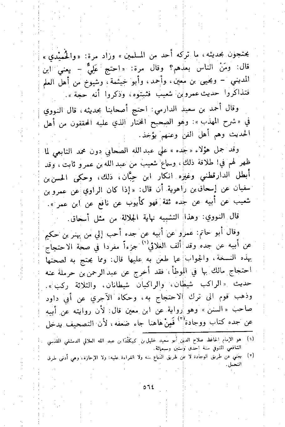 يحتجون بحديثه، ما تركه أحد من المسلمين" وزاد مرة: "والحميدي" قال: ومن الناس بعدهم؟ وقال مرة: "احتج علي -يعني ابن المديني- ويحيى بن معين، وأحمد وأبو خيثمة، وشيوخ من أهل العلم فتذاكروا حديث عمرو بن شعيب فثبتوه، وذكروا أنه حجة".