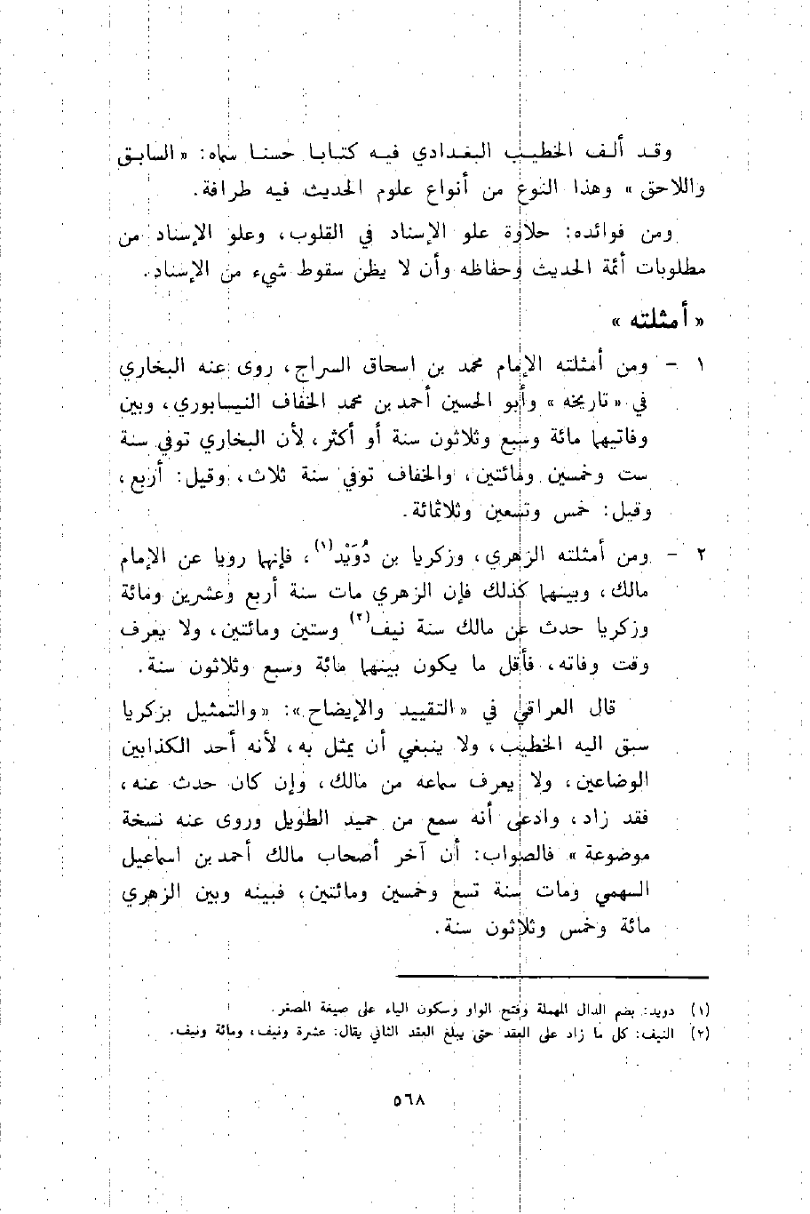 2- ومن أمثلته الزهري، وزكريا بن دويد1، فإنهما رويا عن الإمام مالك، وبينهما كذلك فإن الزهري مات سنة أربع وعشرين ومائة وزكريا حدث عن مالك سنة نيف2 وستين ومائتين، ولا يعرف وقت وفاته، فأقل ما يكون بينهما مائة وسبع وثلاثون سنة.