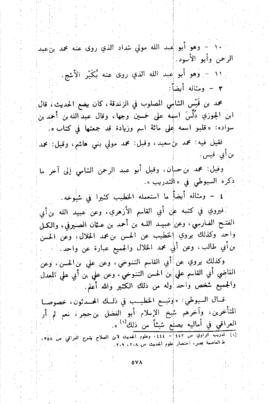 قال السيوطي: "وتبع الخطيب في ذلك المحدثون، خصوصا المتأخرين، وآخرهم شيخ الإسلام أبو الفضل بن حجر، نعم لم أرَ العراقي في أماليه يصنع شيئا من ذلك"1.