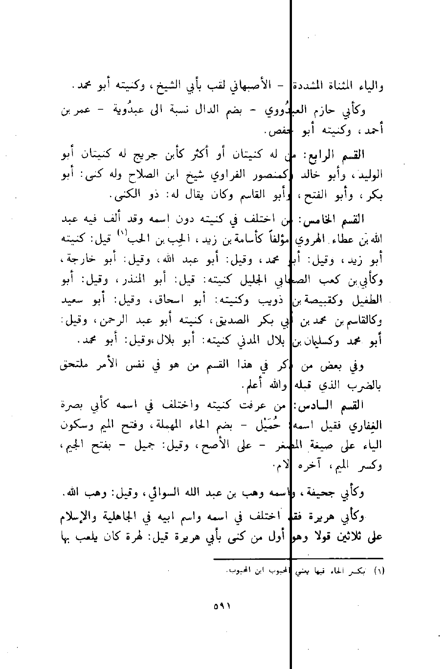 القسم الخامس: من اختلف في كنيته دون اسمه, وقد ألف فيه عبد الله بن عطاء الهروي مؤلفا كأسامة بن زيد، الحب بن الحب1 قيل: كنيته أبو زيد، وقيل: أبو محمد، وقيل: أبو عبد الله، وقيل: أبو خارجة، وكأبي بن كعب الصحابي الجليل كنيته: قيل: أبو المنذر، وقيل: أبو الطفيل وكقبيصة بن ذئيب وكنيته: أبو إسحاق، وقيل: أبو سعيد وكالقاسم بن محمد بن أبي بكر الصديق، كنيته أبو عبد الرحمن، وقيل: أبو محمد وكسليمان بن بلال المدني كنيته: أبو بلال، وقيل: أبو محمد.