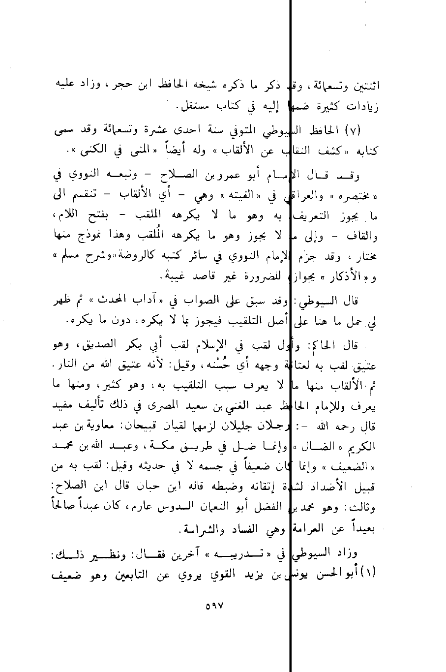 وقد قال الإمام أبو عمرو بن الصلاح, وتبعه النووي في "مختصره" والعراقي في "ألفيته": وهي -أي الألقاب- تنقسم إلى ما يجوز التعريف به, وهو ما لا يكرهه الملقب -بفتح اللام، والقاف- وإلى ما لا يجوز, وهو ما يكرهه الملقب, وهذا نموذج منها مختار، وقد جزم الإمام النووي في سائر كتبه كـ"الروضة", و"شرح مسلم", و"الأذكار" بجوازه للضرورة غير قاصد غيبة.