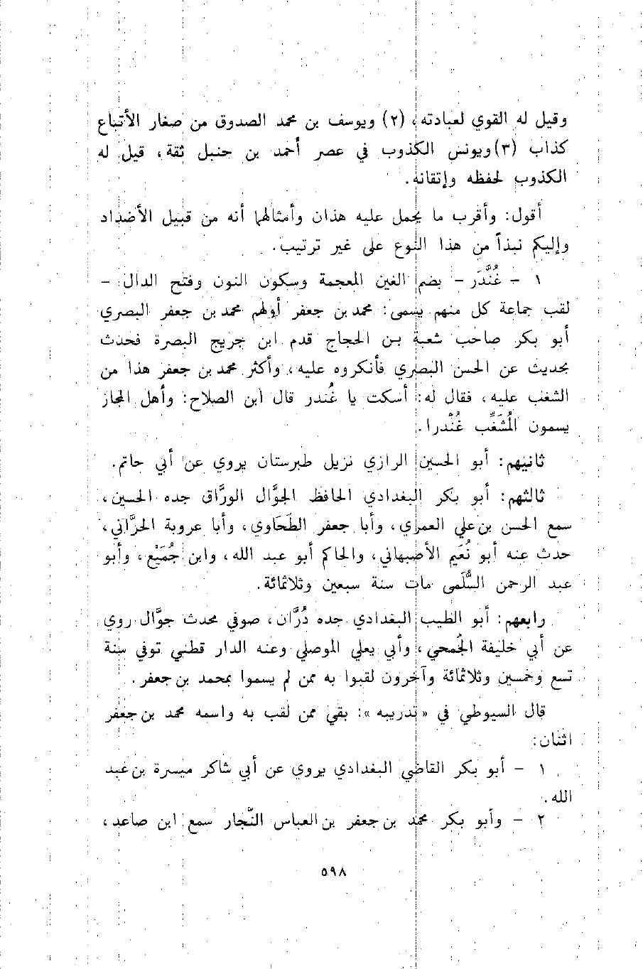1- غندر -بضم الغين المعجمة وسكون النون وفتح الدال- لقب جماعة كل منهم يسمى محمد بن جعفر, أولهم: محمد بن جعفر البصري أبو بكر صاحب شعبة بن الحجاج, قدم ابن جريج البصرة فحدث بحديث عن الحسن البصري فأنكروه عليه، وأكثر محمد بن جعفر هذا من الشغب عليه، فقال له: اسكت يا غندر. قال ابن الصلاح: وأهل المجاز يسمون المشغب غندرا.