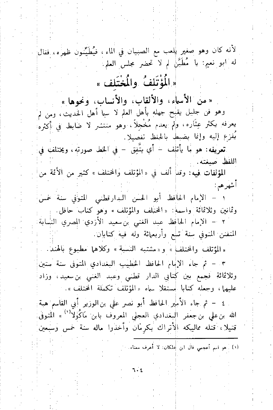 3- ثم جاء الإمام الحافظ الخطيب البغدادي المتوفى سنة ستين وثلاثمائة فجمع بين كتابي الدارقطني وعبد الغني بن سعيد، وزاد عليهما، وجعله كتابا مستقلا سماه "المؤتلف تكملة المختلف".