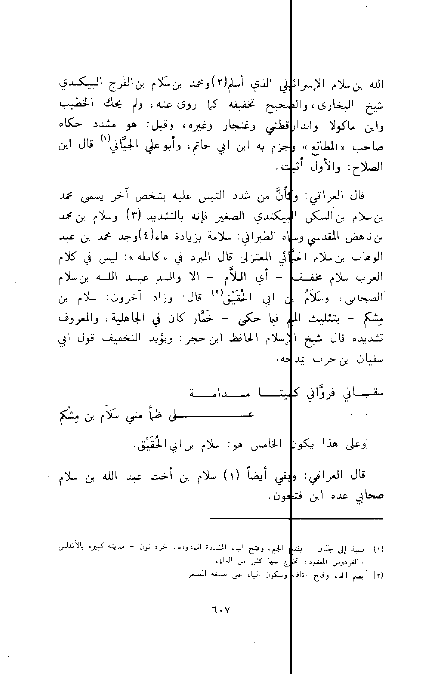 4- وجد محمد بن عبد الوهاب بن سلام الجبائي المعتزلي قال المبرد في "كامله": ليس في كلام العرب سلام مخفف -أي اللام- إلا والد عبد الله بن سلام الصحابي، وسلام بن أبي الحقيق2 قال: وزاد آخرون: سلام بن مشكم -بتثليث الميم فيما حكي- خمار كان في الجاهلية، والمعروف تشديده قال شيخ الإسلام الحافظ ابن حجر: ويؤيد التخفيف قول أبي سفيان بن حرب يمدحه: