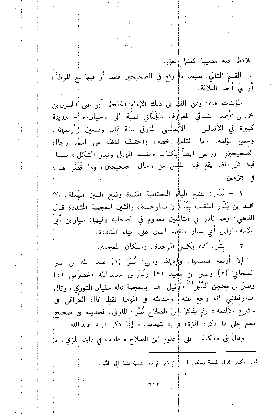 المؤلفات فيه: وممن ألف في ذلك الإمام الحافظ أبو عليّ الحسين بن محمد بن أحمد النسائي المعروف بالجياني نسبة إلى "جيان" -مدينة كبيرة في الأندلس- الأندلسي المتوفى سنة ثمان وتسعين وأربعمائة، وسمى مؤلفه: "ما ائتلف خطه، واختلف لفظه من أسماء رجال الصحيحين", ويسمى أيضا بكتاب "تقييد المهمل وتمييز المشكل" ضبط فيه كل لفظ يقع فيه اللبس من رجال الصحيحين، وما قصر فيه، في جزئين.