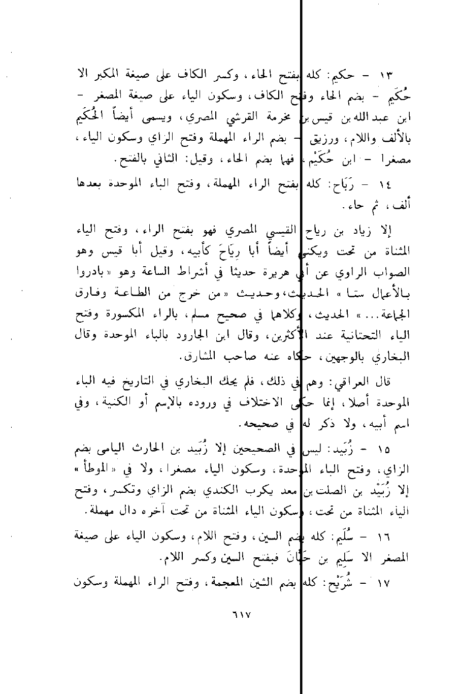 13- حكيم: كله بفتح الحاء، وكسر الكاف على صيغة المكبر إلا حكيم -بضم الحاء وفتح الكاف، وسكون الياء على صيغة المصغر- بن عبد الله بن قيس بن مخرمة القرشي المصري، ويسمى أيضا الحكيم بالألف واللام، ورزيق -بضم الراء المهملة وفتح الزاي وسكون الياء، مصغرا- بن حكيم، فهما بضم الحاء، وقيل: الثاني بالفتح.