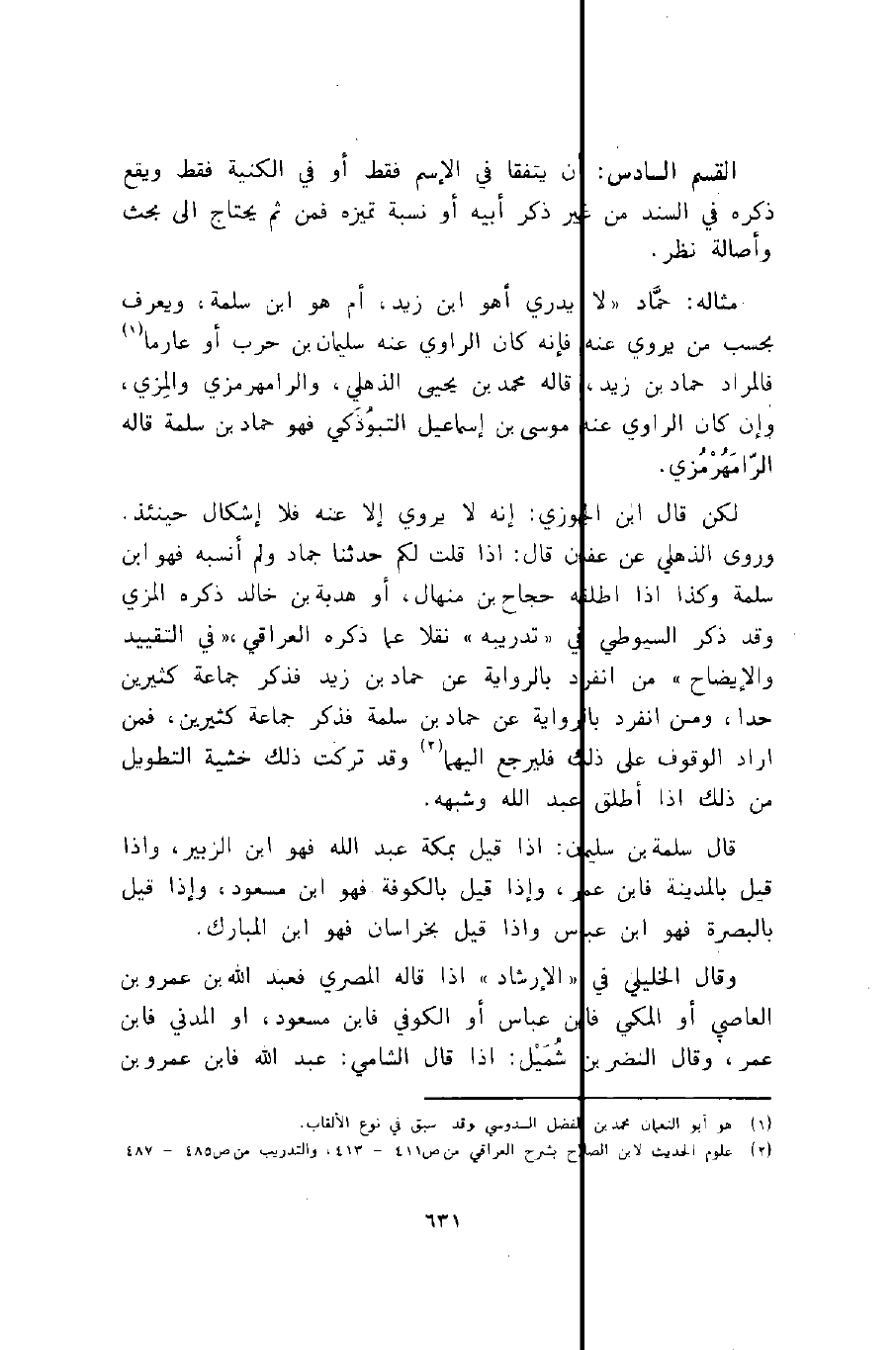 القسم السادس: أن يتفقا في الاسم فقط أو في الكنية فقط ويقع ذكره في السند من غير ذكر أبيه أو نسبة تميزه فمن ثم يحتاج إلى بحث وأصالة نظر.
