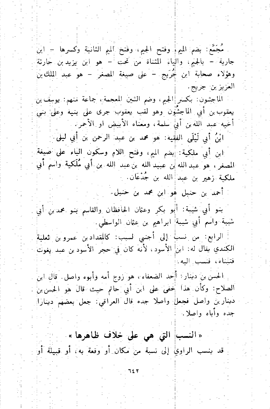 الرابع: من نسب إلى أجنبي لسبب: كالمقداد بن عمرو بن ثعلبة الكندي يقال له: ابن الأسود؛ لأنه كان في حجر الأسود بن عبد يغوث فتبناه، فنسب إليه.