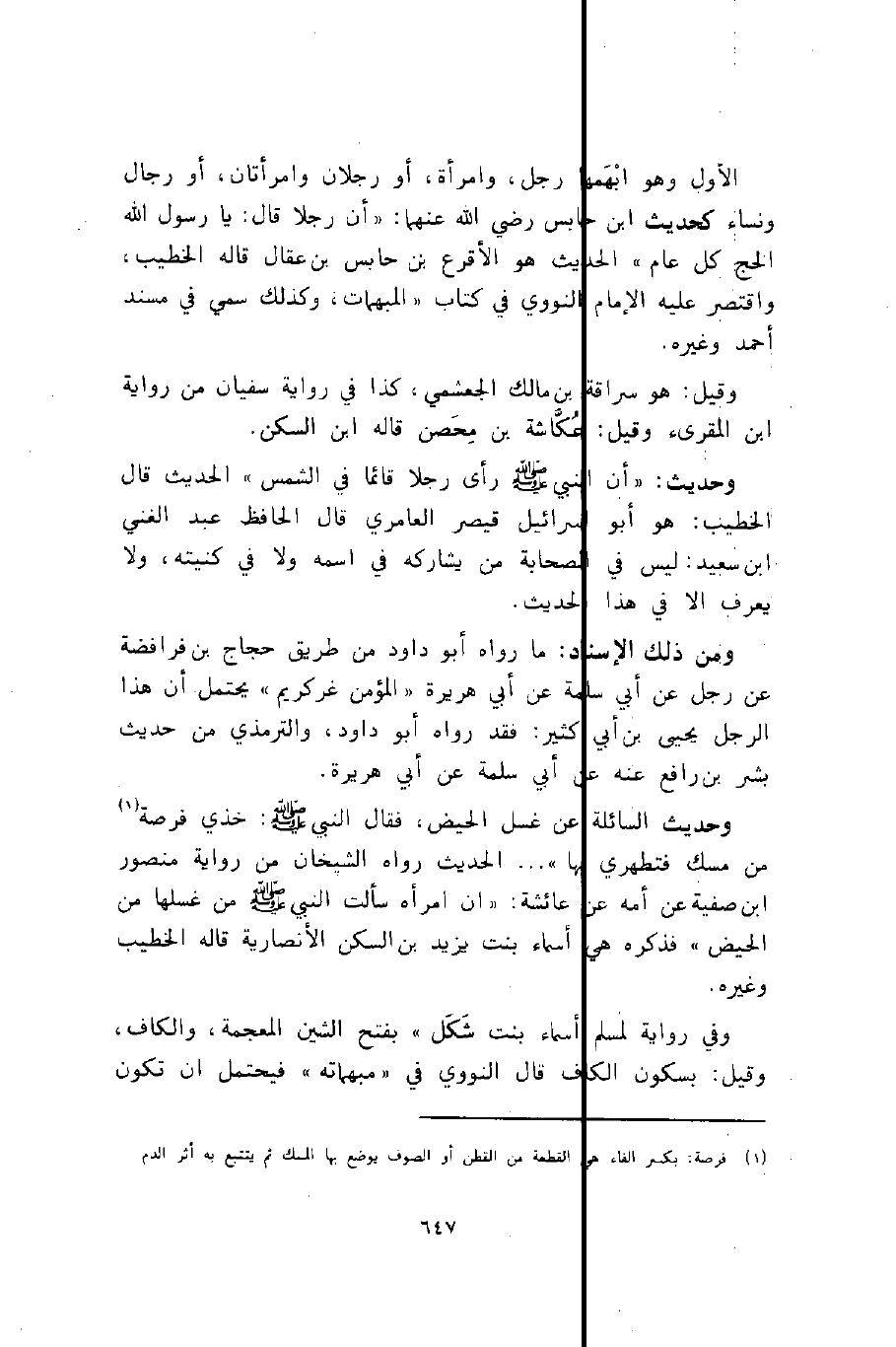 الأول وهو أبهمها رجل، وامرأة، أو رجلان وامرأتان، أو رجال ونساء كحديث ابن حابس رضي الله عنهما: "أن رجلا قال: يا رسول الله الحج كل عام ... " الحديث. هو الأقرع بن حابس بن عقال قاله الخطيب، واقتصر عليه الإمام النووي في كتاب "المبهمات" وكذلك سمى في مسند أحمد وغيره.