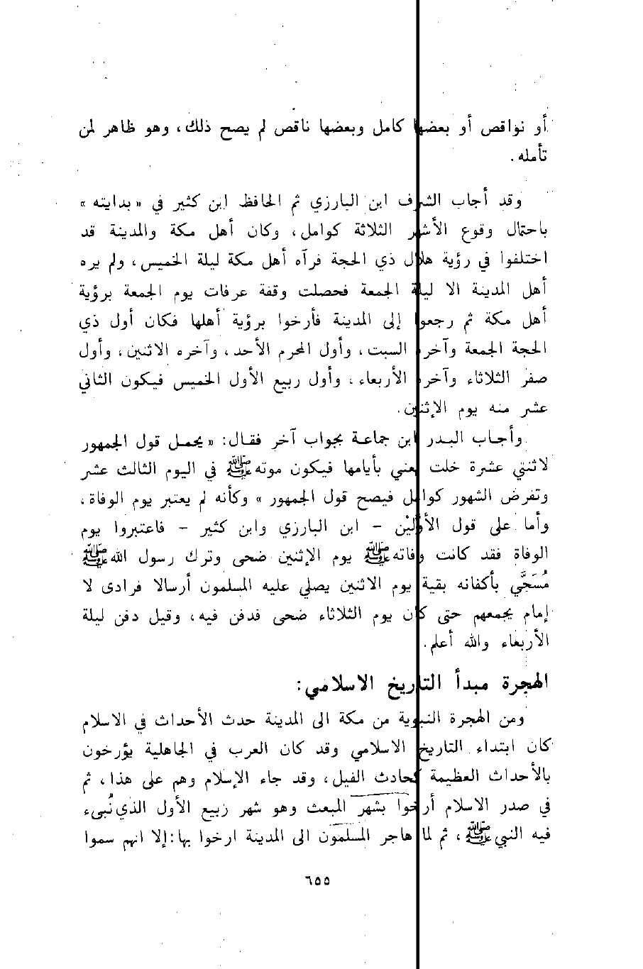 وقد أجاب الشرف ابن البارزي ثم الحافظ ابن كثير في "بدايته" باحتمال وقوع الأشهر الثلاثة كوامل، وكان أهل مكة والمدينة قد اختلفوا في رؤية هلال ذي الحجة فرآه أهل مكة ليلة الخميس، ولم يره أهل المدينة إلا ليلة الجمعة فحصلت وقفة عرفات يوم الجمعة برؤية أهل مكة, ثم رجعوا إلى المدينة فأرخوا برؤية أهلها, فكان أول ذي الحجة الجمعة وآخره السبت، وأول المحرم الأحد، وآخره الاثنين، وأول صفر الثلاثاء وآخره الأربعاء، وأول ربيع الأول الخميس, فيكون الثاني عشر منه يوم الاثنين.