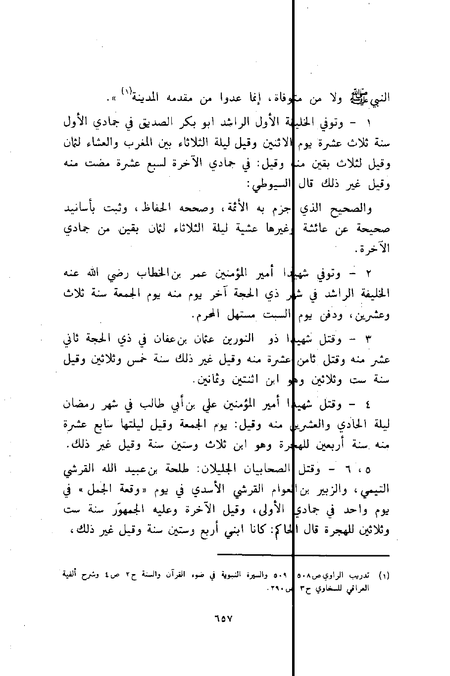 3- وقتل شهيدا ذو النورين عثمان بن عفان في ذي الحجة ثاني عشر منه, وقيل: ثامن عشرة منه, وقيل: غير ذلك سنة خمس وثلاثين, وقيل: سنة ست وثلاثين, وهو ابن اثنتين وثمانين.