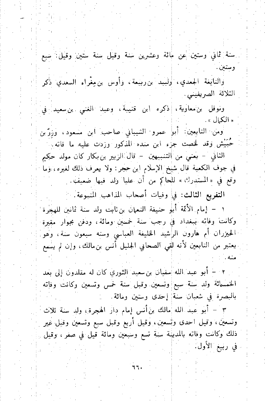 3- أبو عبد الله مالك بن أنس إمام دار الهجرة، ولد سنة ثلاث وتسعين، وقيل: إحدى وتسعين، وقيل: أربع, وقيل: سبع وتسعين, وقيل: غير ذلك, وكانت وفاته بالمدينة سنة تسع وسبعين ومائة, قيل: في صفر، وقيل: في ربيع الأول.