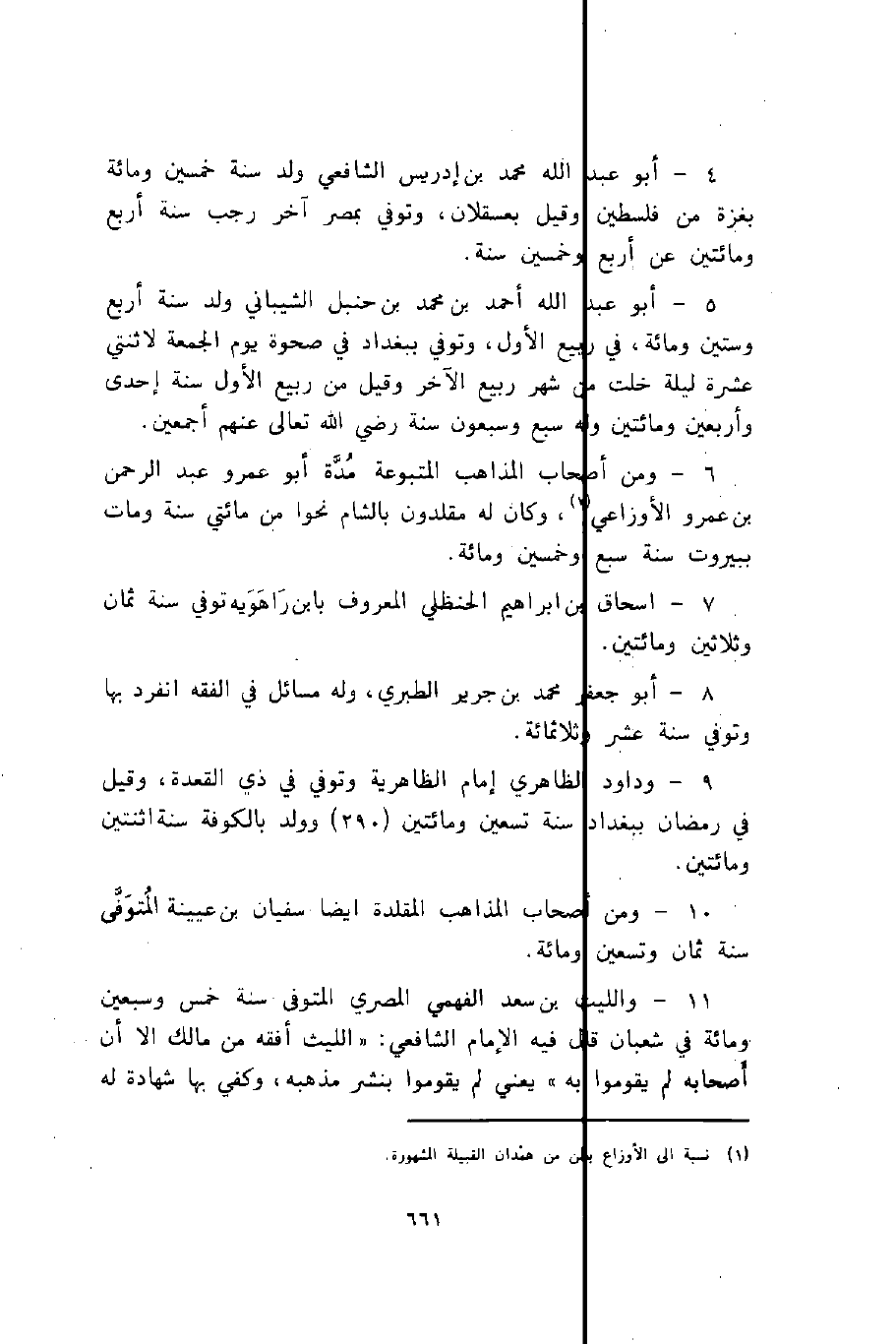 6- ومن أصحاب المذاهب المتبوعة مدة أبو عمرو عبد الرحمن بن عمرو الأوزاعي1، وكان له مقلدون بالشام نحو من مائتي سنة ومات ببيروت سنة سبع وخمسين ومائة.