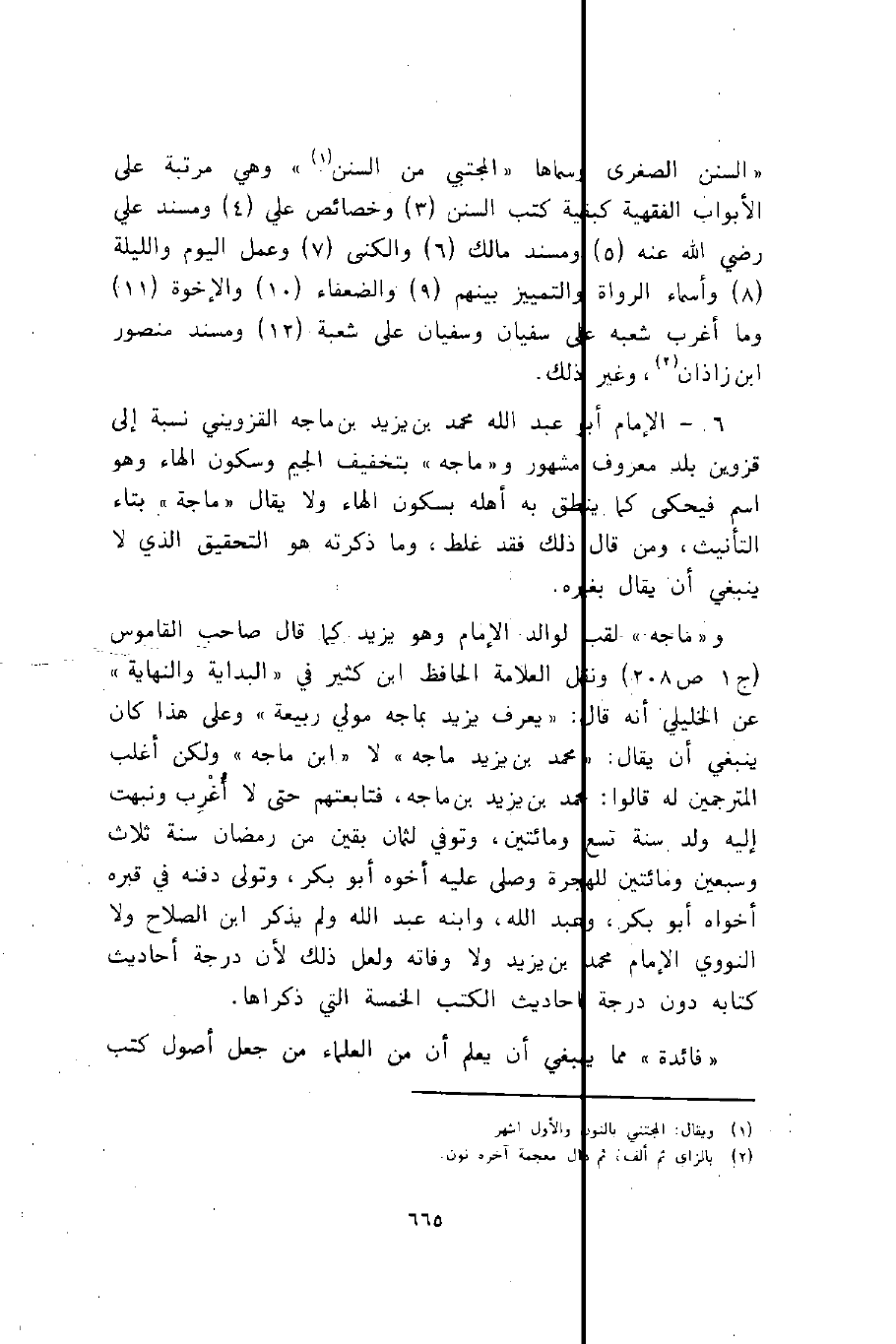 6- الإمام أبو عبد الله محمد بن يزيد بن ماجه القزويني نسبة إلى قزوين بلد معروف مشهور و"ماجه" بتخفيف الجيم وسكون الهاء, وهو اسم, فيحكى كما ينطق به أهله بسكون الهاء, ولا يقال: "ماجه" بتاء التأنيث، ومن قال ذلك فقد غلط، وما ذكرته هو التحقيق الذي لا ينبغي أن يقال بغيره.