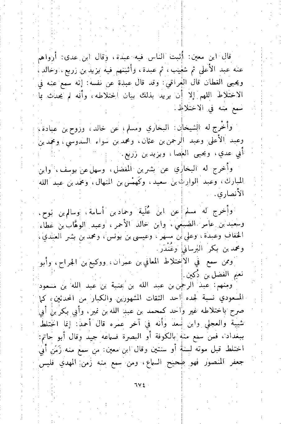 ومنهم: عبد الرحمن بن عبد الله بن عتبة بن عبد الله بن مسعود المسعودي نسبة لجده أحد الثقات المشهورين والكبار من المحدثين، كما صرح باختلاطه غير واحد كمحمد بن عبد الله بن نمير، وأبي بكر بن أبي شيبة والعجلي وابن سعد وأنه في آخر عمره قال أحمد: إنما اختلط ببغداد، فمن سمع منه بالكوفة أو البصرة فسماعه جيد وقال أبو حاتم: اختلط قبل موته لسنة أو سنتين وقال ابن معين: من سمع منه زمن أبي جعفر المنصور فهو صحيح السماع، ومن سمع منه زمن المهدي فليس
