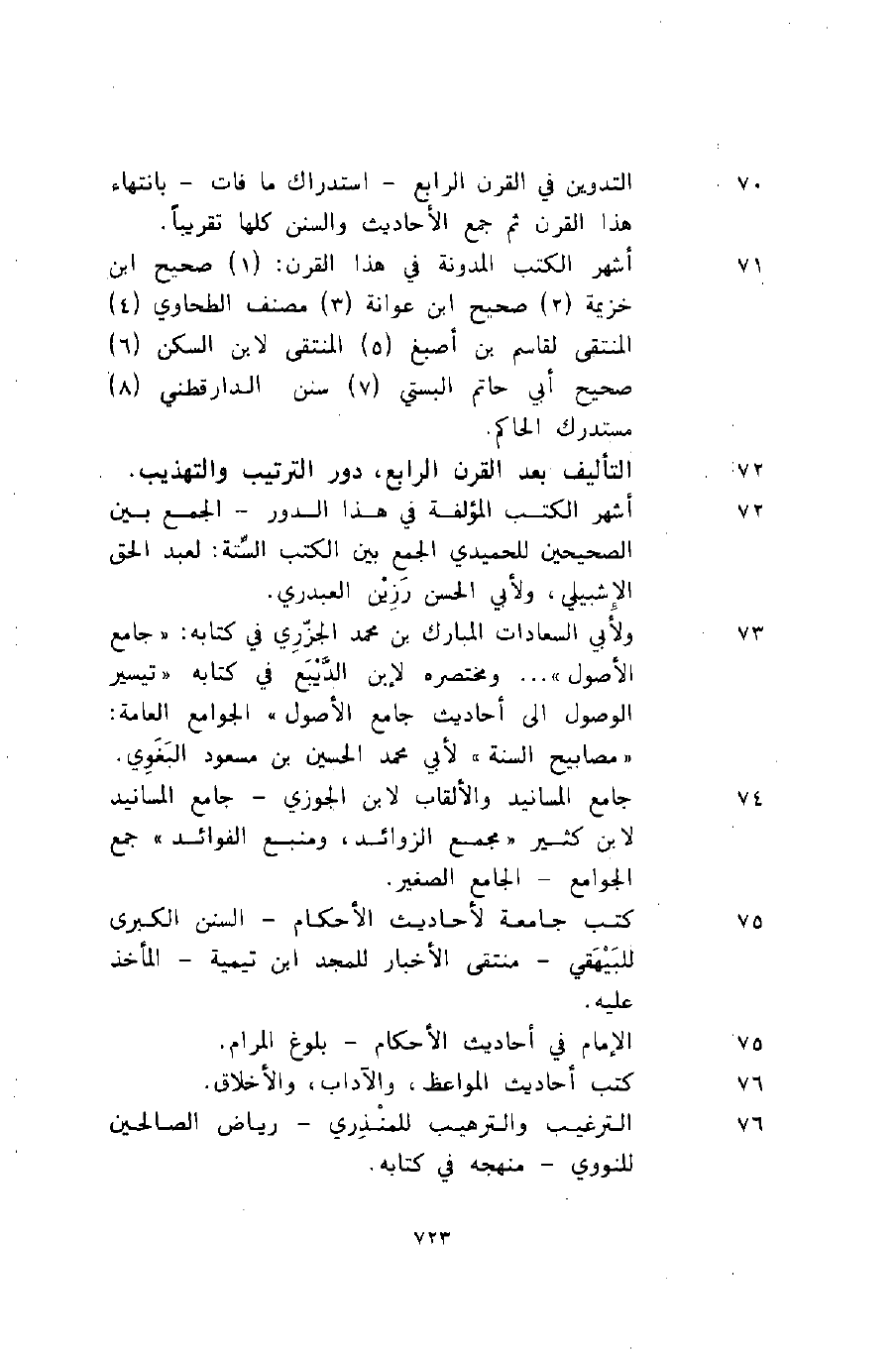 73 ولأبي السعادات المبارك بن محمد الجزري في كتابه: "جامع الأصول" ومختصره لابن الديبع في كتابه "تيسير الوصول إلى أحاديث جامع الأصول" الجوامع العامة: "مصابيح السنة" لأبي محمد الحسين بن مسعود البغوي
