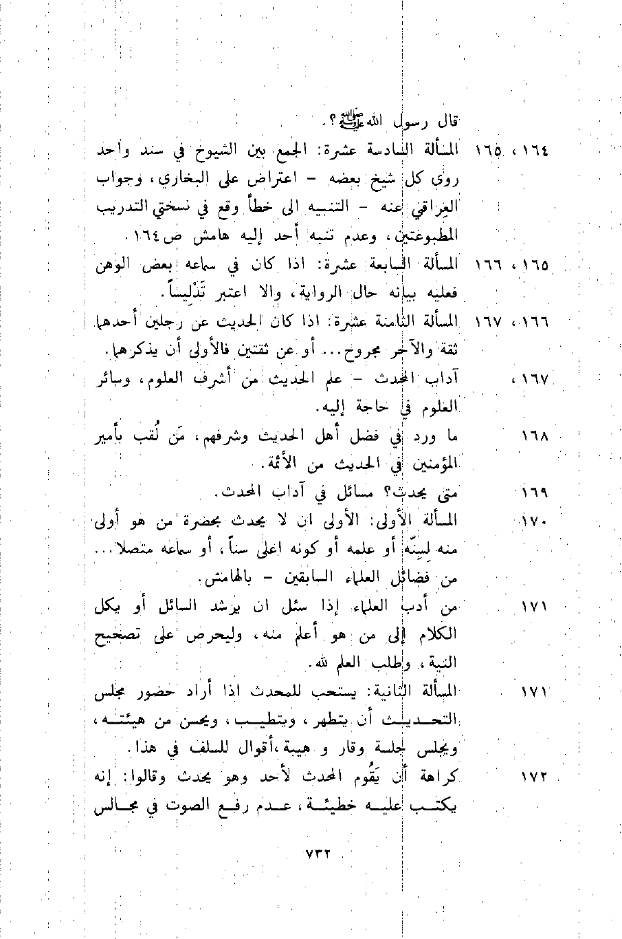 171 المسألة الثانية: يستحب للمحدث إذا أراد حضور مجلس التحديث أن يتطهر ويتطيب، ويحسن من هيئته، ويجلس جلسة وقار وهيبة، أقوال للسلف في هذا