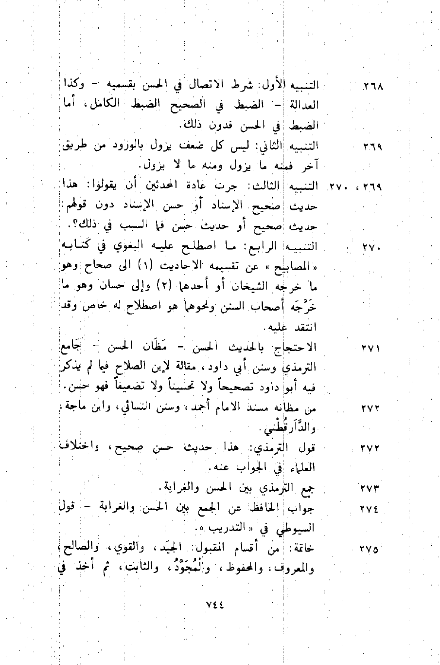 268 التنبيه الأول: شرط الاتصال في الحسن بقسميه, وكذا العدالة, الضبط في الصحيح الضبط الكامل، أما الضبط في الحسن فدون ذلك