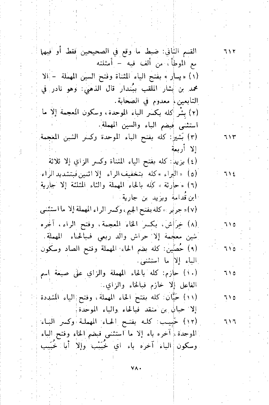 616 12- حبيب: كله بفتح الحاء المهملة وكسر الباء الموحدة، آخره باء إلا ما استثنى فبضم الخاء وفتح الباء وسكون الياء آخره باء أي خبيب وإلا أبا خبيب
