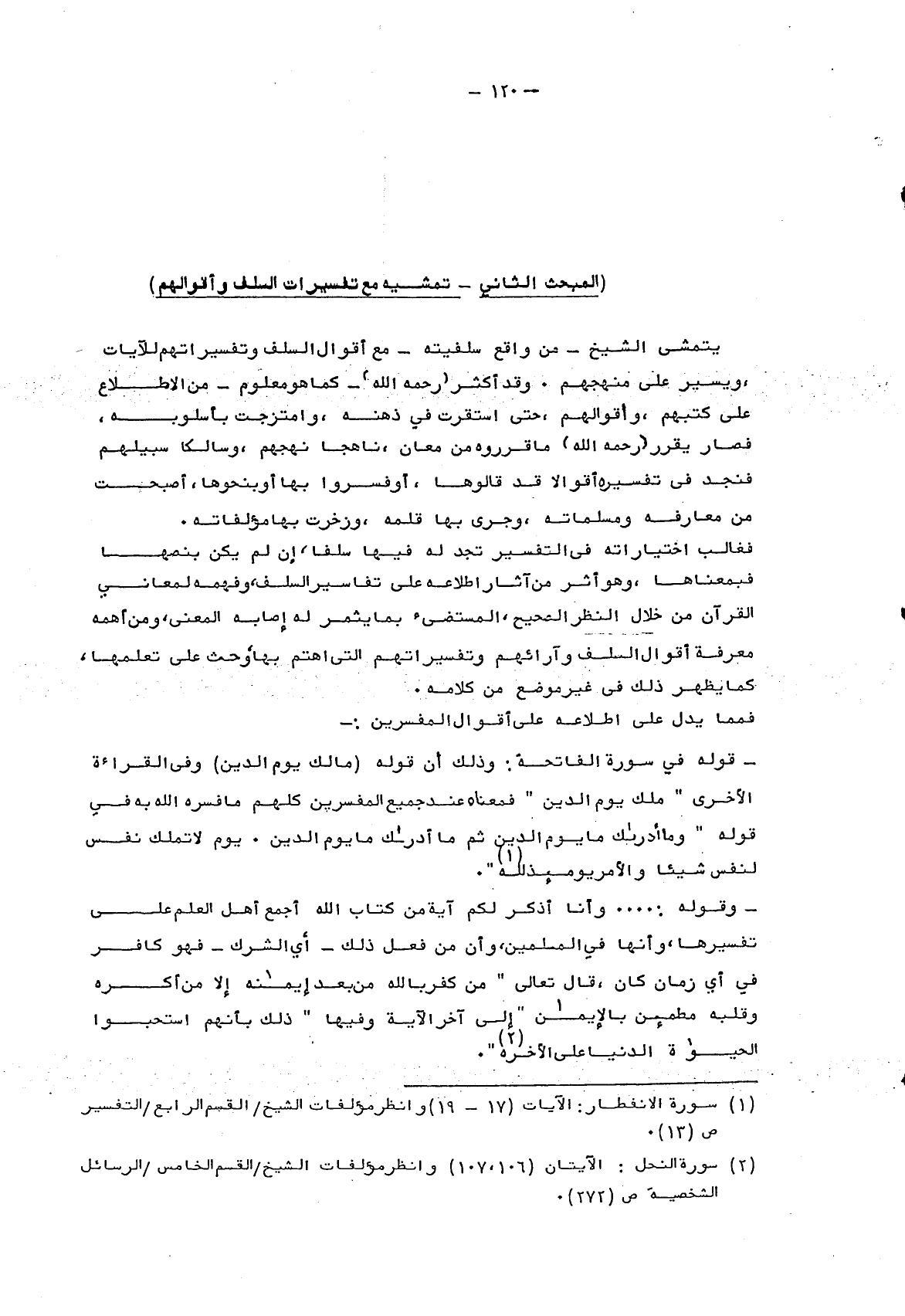 يتمشى الشيخ- من واقع سلفيته- مع أقوال السلف وتفسير اتهم للآيات، ويسير على منهجهم. وقد أكثر "رحمه الله"- كما هو معلوم- من الإطلاع على كتبهم، وأقوالهم، حتى استقرت في ذهنه، وامتزجت بأسلوبه، فصار يقرر "رحمه الله" ما قرروه من معان، ناهجا نهجهم، وسالكاً سبيلهم فنجد في تفسيره أقوالا قد قالوها، أو فسروا بها أو بنحوها، أصبحت من معارفه ومسلماته، وجرى بها قلمه، وزخرت بها مؤلفاته.