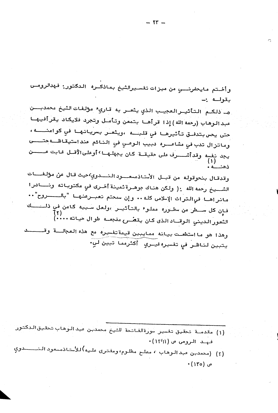 1 مقدمة تحقيق تفسير سورة الفاتحة للشيخ محمد بن عبد الوهاب تحقيق الدكتور فهد الرومي ص "11، 12".