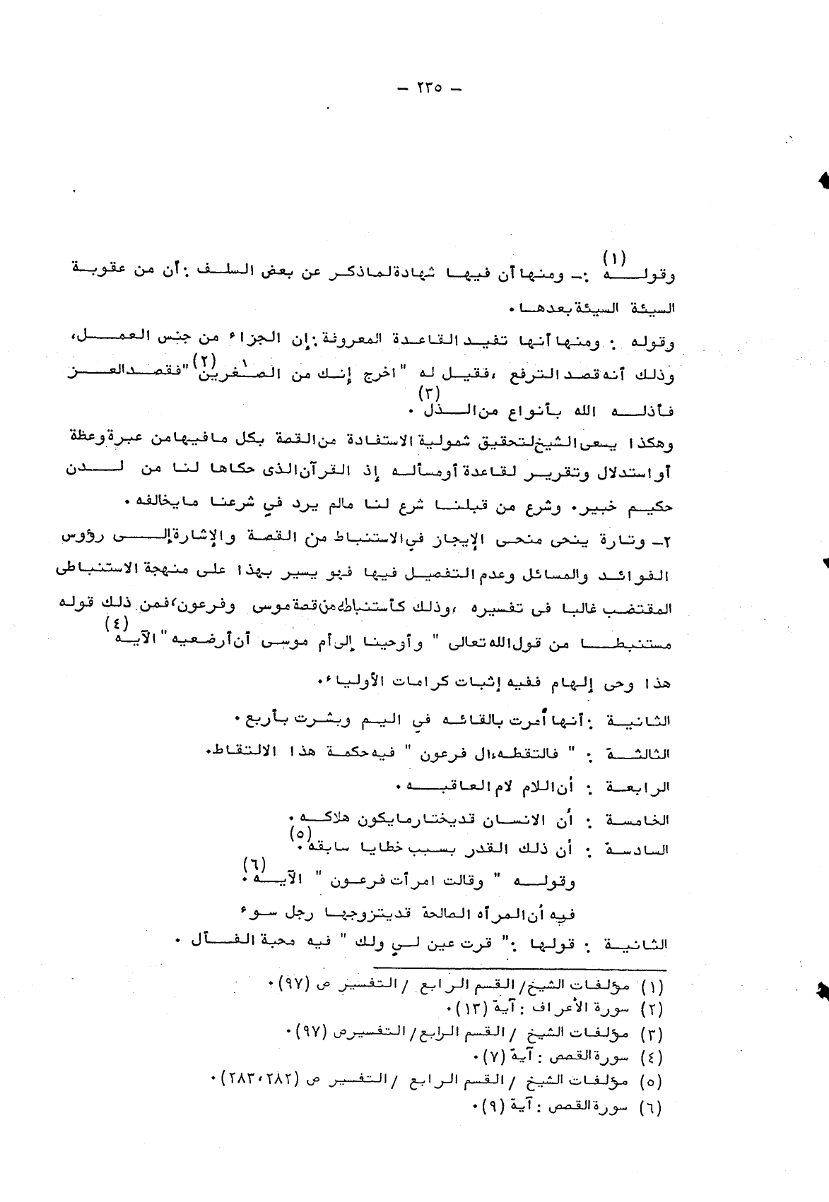 2- وتارة ينحى منحى الإيجاز في الاستنباط من القصة والإشارة إلى رؤوس الفوائد والمسائل وعدم التفصيل فيها فهو يسير بهذا على منهجه الاستنباطي المقتضب غالباً في تفسيره، وذلك كاستنباطه من قصة موسى وفرعون، فمن ذلك قوله مستنبطاً من قول الله تعالى: {وَأَوْحَيْنَا إِلَى أُمِّ مُوسَى أَنْ أَرْضِعِيهِ} الآية4.
