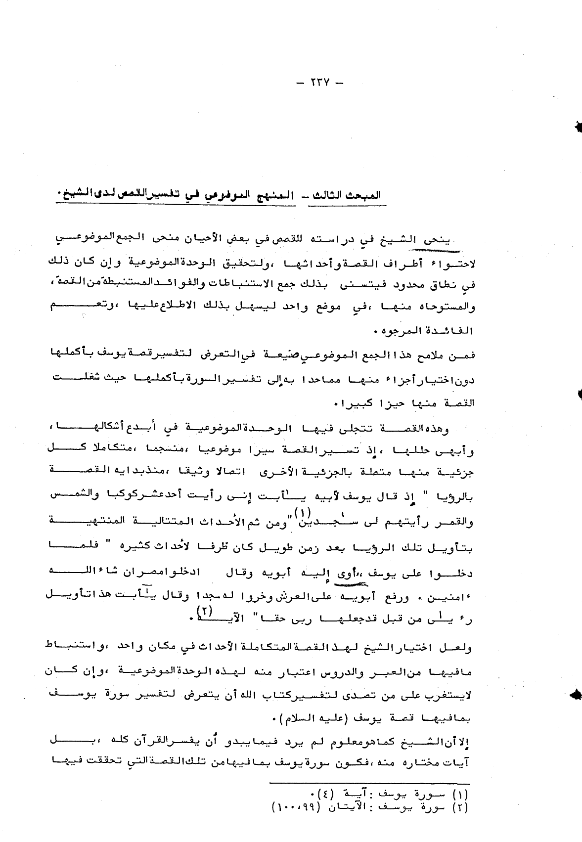 المبحث الثالث: المنهج الموضوعي في تفسير القصص لدى الشيخ