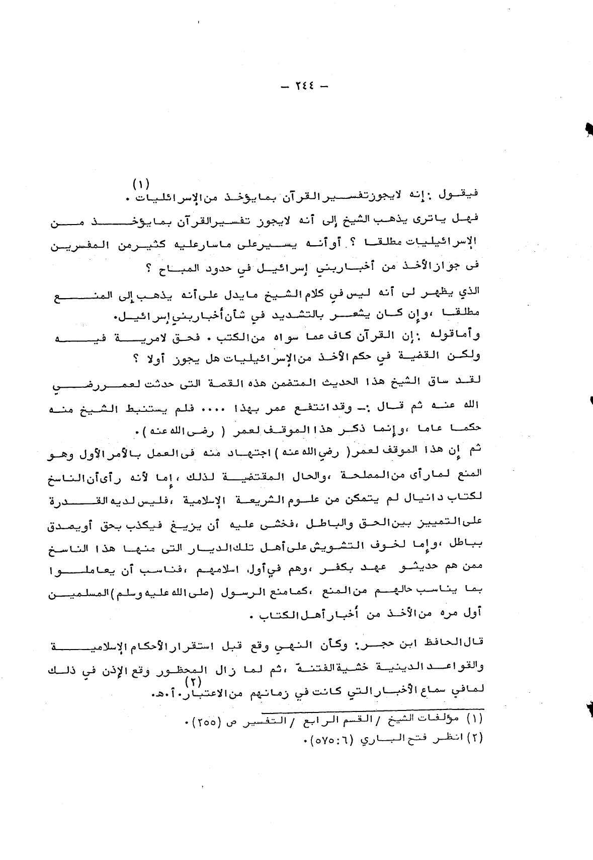الذي يظهر لي أنه ليس في كلام الشيخ ما يدل على أنه يذهب إلى المنع مطلقاً، وإن كان يشعر بالتشديد في شأن أخبار بني إسرائيل.
