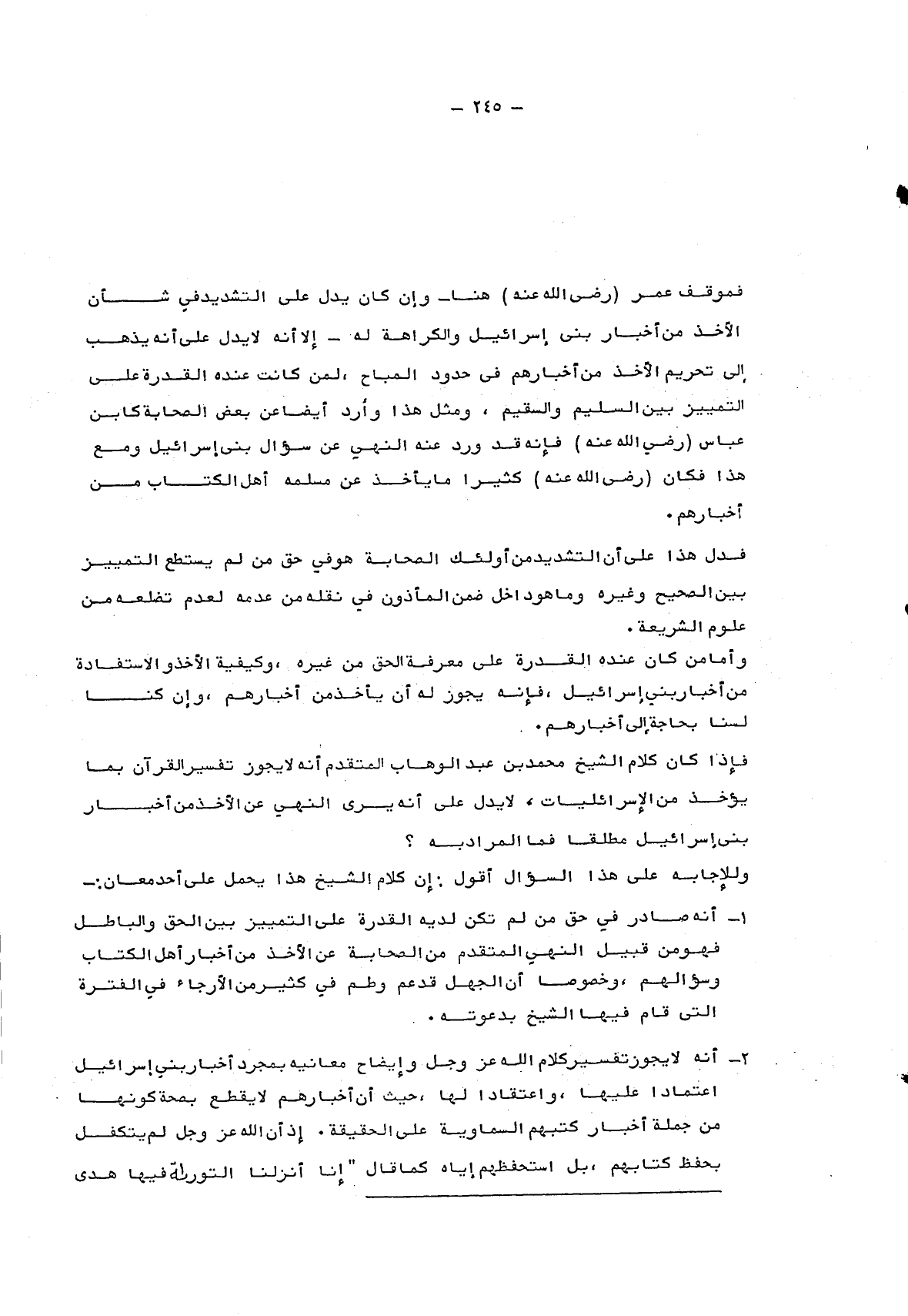 فإذا كان كلام الشيخ محمد بن عبد الوهاب المتقدم أنه لا يجوز تفسير القرآن بما يؤخذ من الإسرائيليات، لا يدل على أنه يرى النهي عن الأخذ من أخبار بني إسرائيل مطلقاً فما المراد به؟