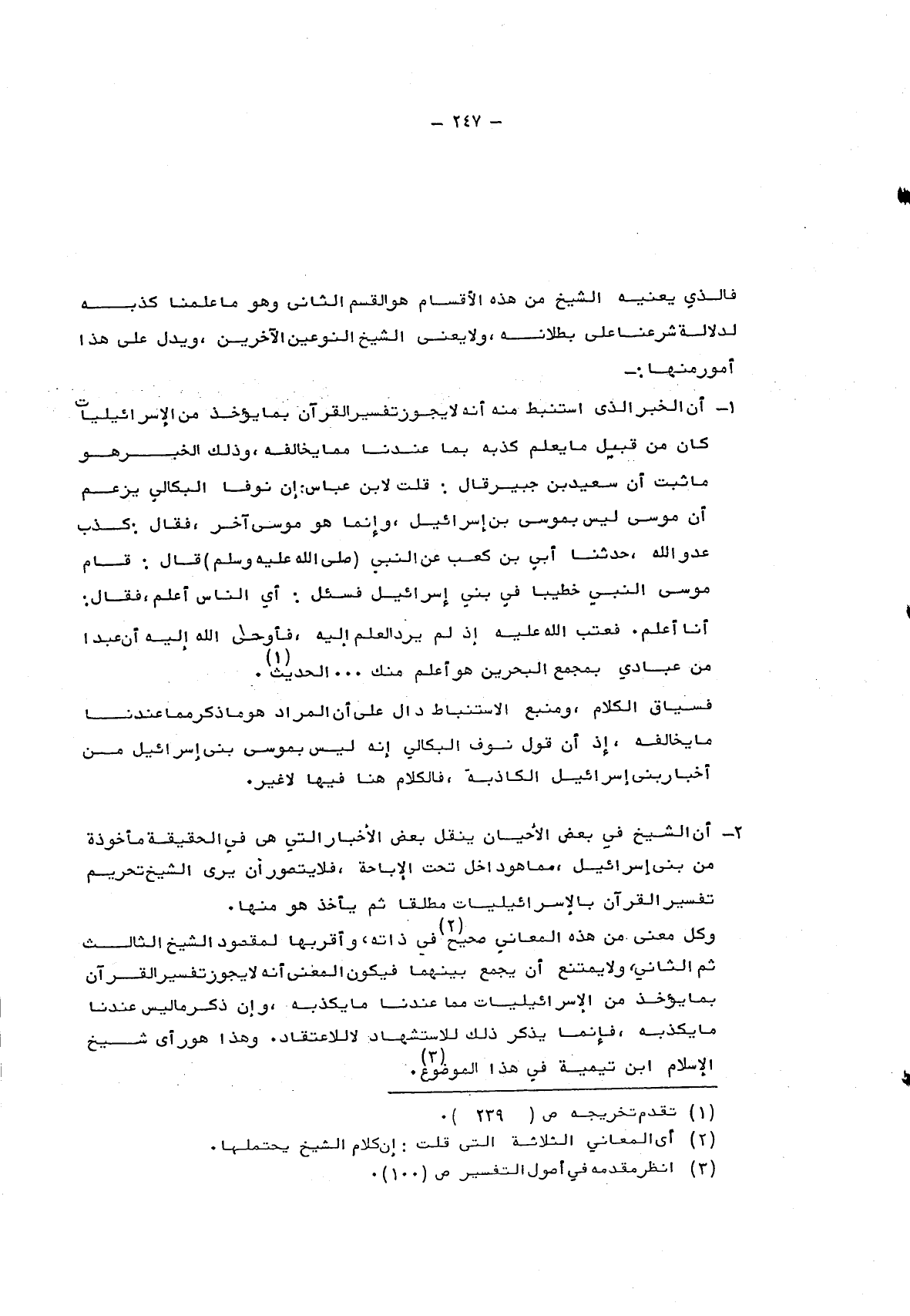 2- أن الشيخ في بعض الأحيان ينقل بعض الأخبار التي هي في الحقيقة مأخوذة من بنى إسرائيل، مما هو داخل تحت الإباحة، فلا يتصور أن يرى الشيخ تحريم تفسير القرآن بالإسرائيليات مطلقاً ثم يأخذ هو منها.