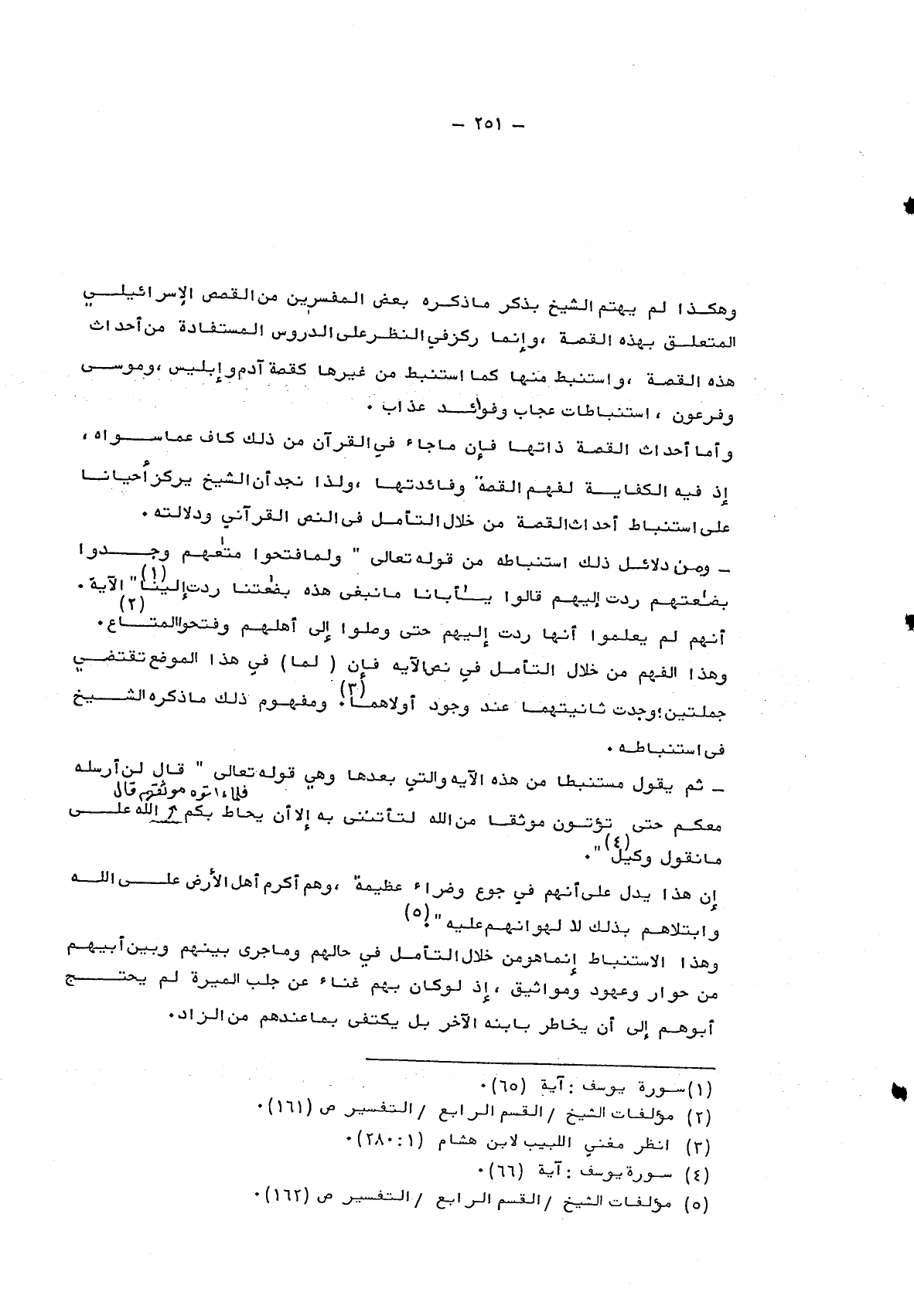 وهكذا لم يهتم الشيخ بذكر ما ذكره بعض المفسرين من القصص الإسرائيلي المتعلق بهذه القصة، وإنما ركز في النظر على الدروس المستفادة من أحداث هذه القصة، واستنبط منها كما استنبط من غيرها كقصة آدم وإبليس، وموسى وفرعون، استنباطات عجاب وفوائد عذاب.