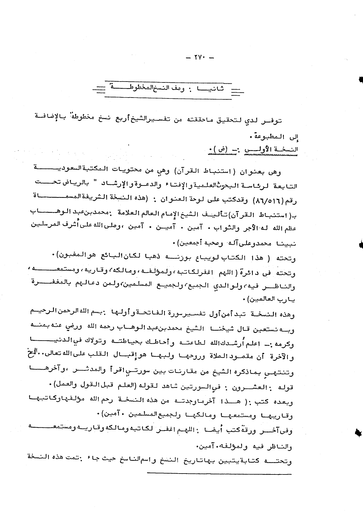 وهذه النسخة تبدأ من أول تفسير سورة الفاتحة وأولها: بسم الله الرحمن الرحيم وبه نستعين قال شيخنا الشيخ محمد بن عبد الوهاب رحمه الله ورضي عنه بمنه وكرمه: اعلم أرشدك الله لطاعته وأحاطك بحياطته وتولاك في الدنيا والآخرة إن مقصود الصلاة وروحهما ولبها هو إقبال القلب على الله تعالى..إلخ وتنتهي بما ذكر، الشيخ من مقارنات بين سورتي اقرأ والمدثر، وآخرها قوله: العشرون: في السورتين شاهد لقوله: "العلم قبل القول والعمل".