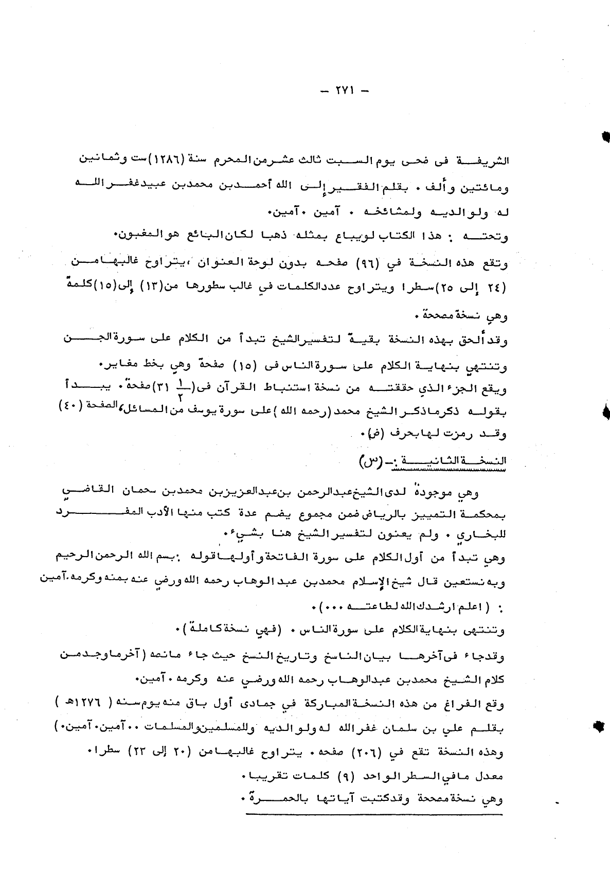 وقد ألحق بهذه النسخة بقية لتفسير الشيخ تبدأ من الكلام على سورة الجن وتنتهي بنهاية الكلام على سورة الناس في "15" صفحة وهي بخط مغاير.