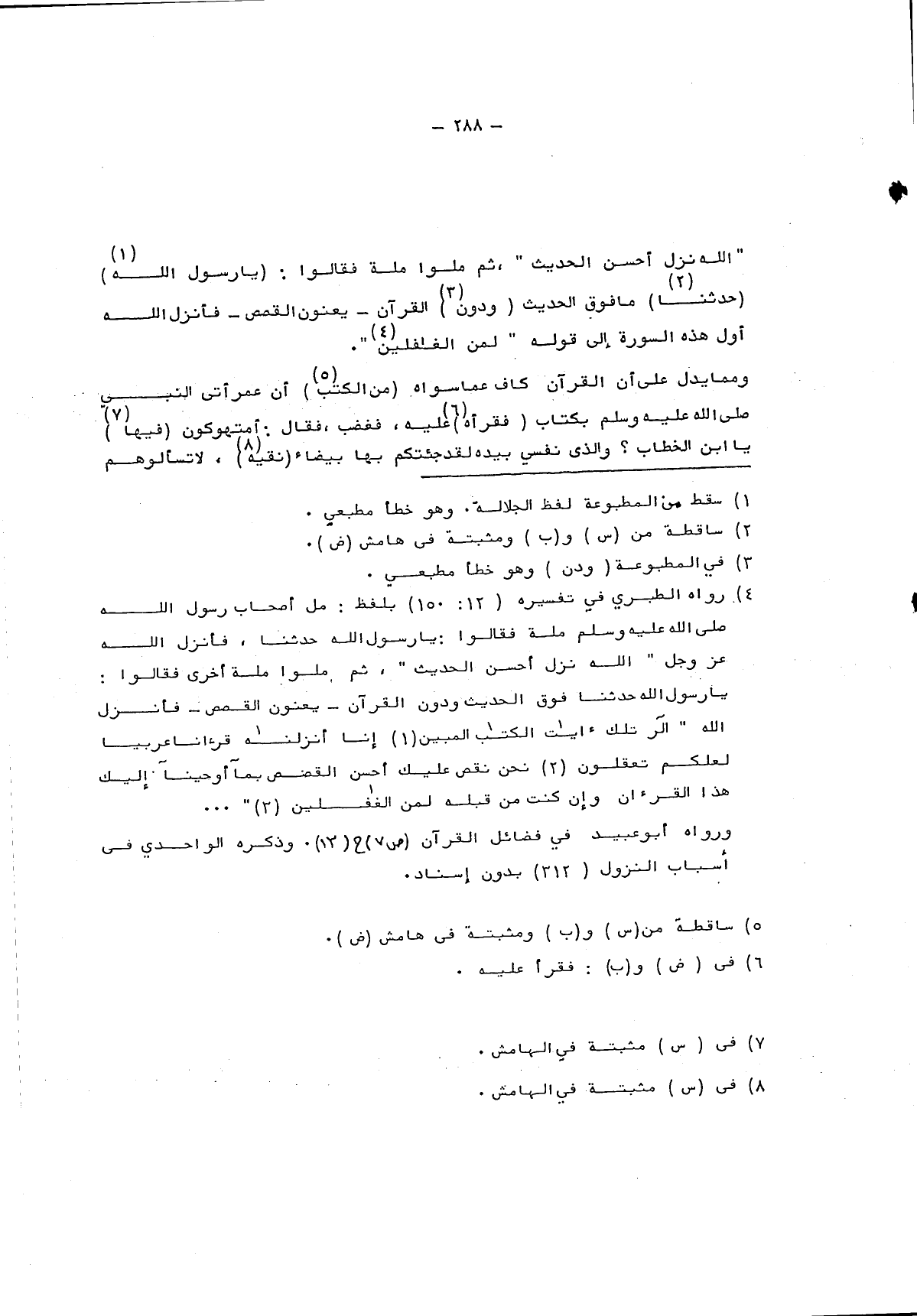 4 رواه الطبري في تفسيره "12: 150" بلفظ: مل أصحاب رسول الله صلى الله عليه وسلم ملة فقالوا: يا رسول الله حدثنا، فأنزل الله عز وجل: {اللَّهُ نَزَّلَ أَحْسَنَ الْحَدِيثِ} ، ثم ملوا ملة أخرى فقالوا: يا رسول الله حدثنا فوق الحديث ودون القرآن – يعنون القصص – فأنزل الله: {الر تِلْكَ آيَاتُ الْكِتَابِ الْمُبِينِ إِنَّا أَنْزَلْنَاهُ قُرْآناً عَرَبِيّاً لَعَلَّكُمْ تَعْقِلُونَ نَحْنُ نَقُصُّ عَلَيْكَ أَحْسَنَ الْقَصَصِ بِمَا أَوْحَيْنَا إِلَيْكَ هَذَا الْقُرْآنَ وَإِنْ كُنْتَ مِنْ قَبْلِهِ لَمِنَ الْغَافِلِينَ} .