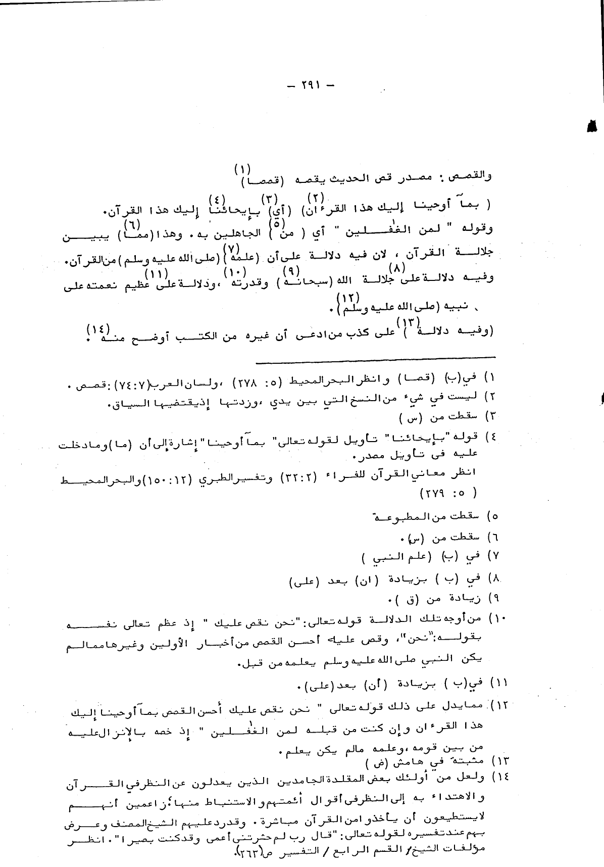 12 مما يدل على ذلك قوله تعالى: {نَحْنُ نَقُصُّ عَلَيْكَ أَحْسَنَ الْقَصَصِ بِمَا أَوْحَيْنَا إِلَيْكَ هَذَا الْقُرْآنَ وَإِنْ كُنْتَ مِنْ قَبْلِهِ لَمِنَ الْغَافِلِينَ} إذ خصه بالإنزال عليه من بين قومه، وعلمه ما لم يكن يعلم.