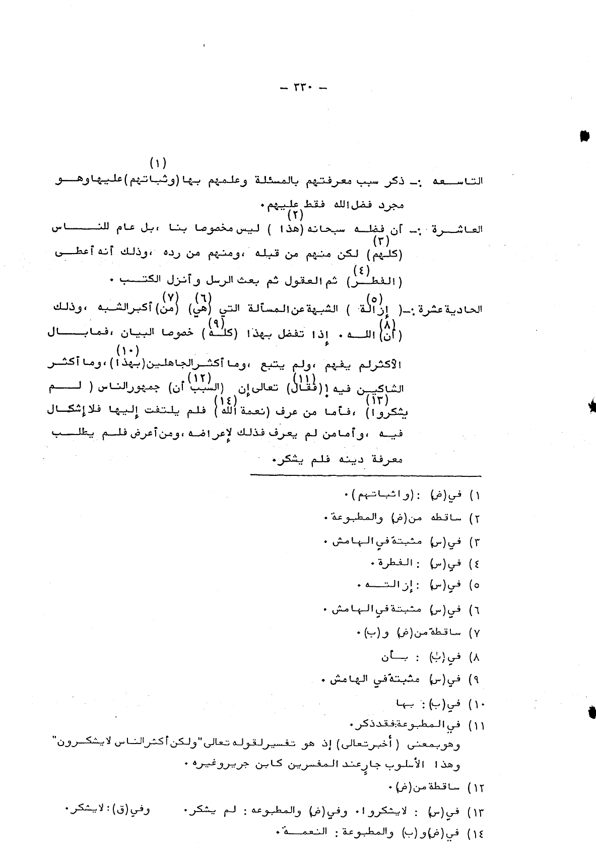 الحادية عشرة: "إزالة"5 الشبهة عن المسألة التي "هي"6 "من"7 أكبر الشبه، وذلك "أن"8 الله. إذا تفضل بهذا "كله"9 خصوصا البيان، فما بال الأكثر لم يفهم، ولم يتبع، وما أكثر الجاهلين "بهذا"10، وما أكثر الشاكين فيه! "فقال"11 تعالى إن "السبب أن"12 جمهور الناس "لم يشكروا" 13، فأما من عرف "نعمة الله"14 فلم يلتفت إليها فلا إشكال فيه، وأما من لم يعرف فذلك لإعراضه، ومن أعرض فلم يطلب معرفة دينه فلم يشكر.