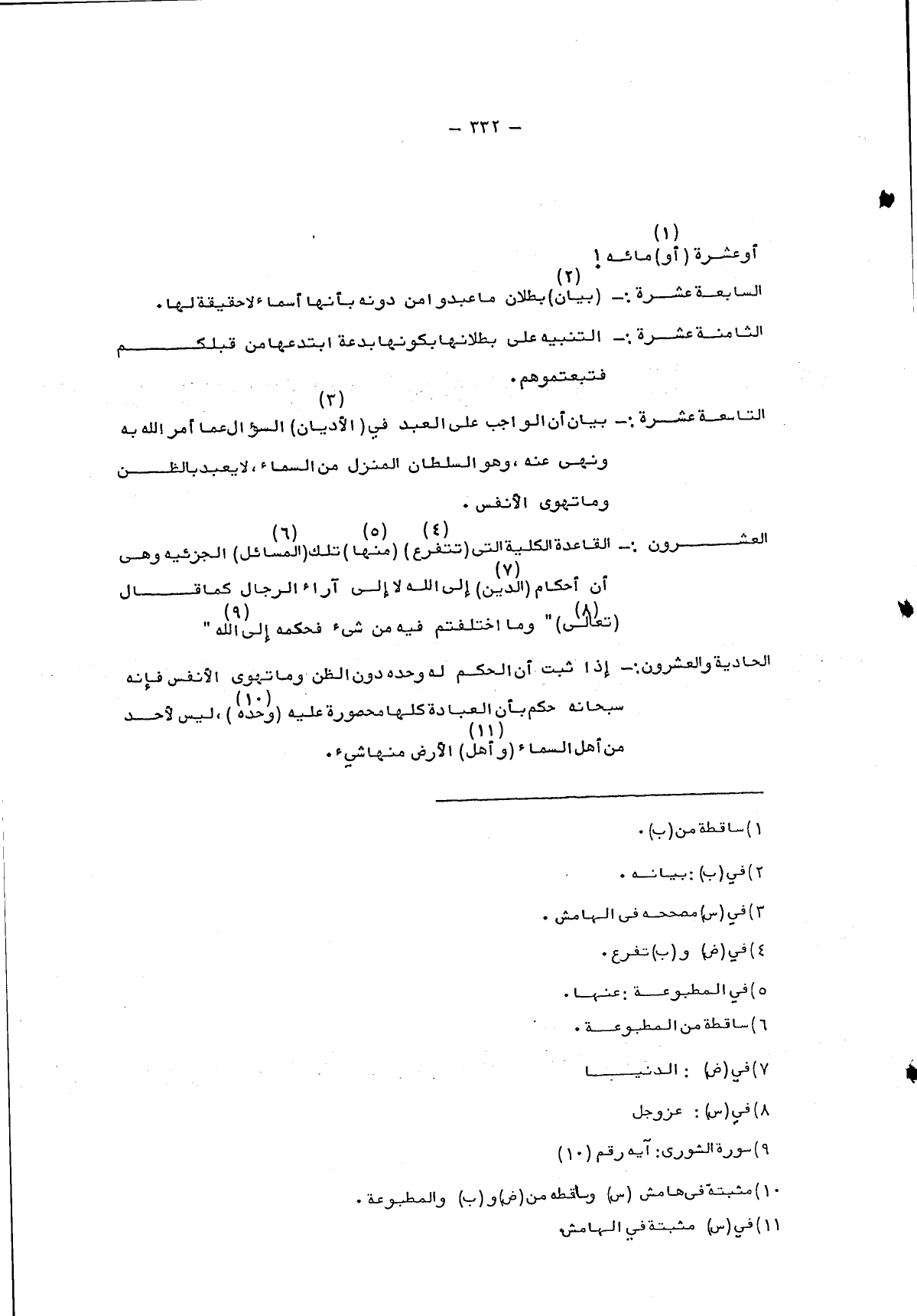العشرون:- القاعدة الكلية التي "تتفرع"4 "منها"5 تلك "المسائل"6 الجزئية وهي أن أحكام "الدين"7 إلى الله لا إلى آراء الرجال كما قال "تعالى"8: {وَمَا اخْتَلَفْتُمْ فِيهِ مِنْ شَيْءٍ فَحُكْمُهُ إِلَى اللَّهِ ذَلِكُمُ اللَّهُ} 9 الحادية والعشرون: إذا ثبت أن الحكم له وحده دون الظن وما تهوى الأنفس فإنه سبحانه حكم بأن العبادة كلها محصورة عليه "وحده"10، ليس لأحد من أهل السماء "وأهل"11 الأرض منها شيء.