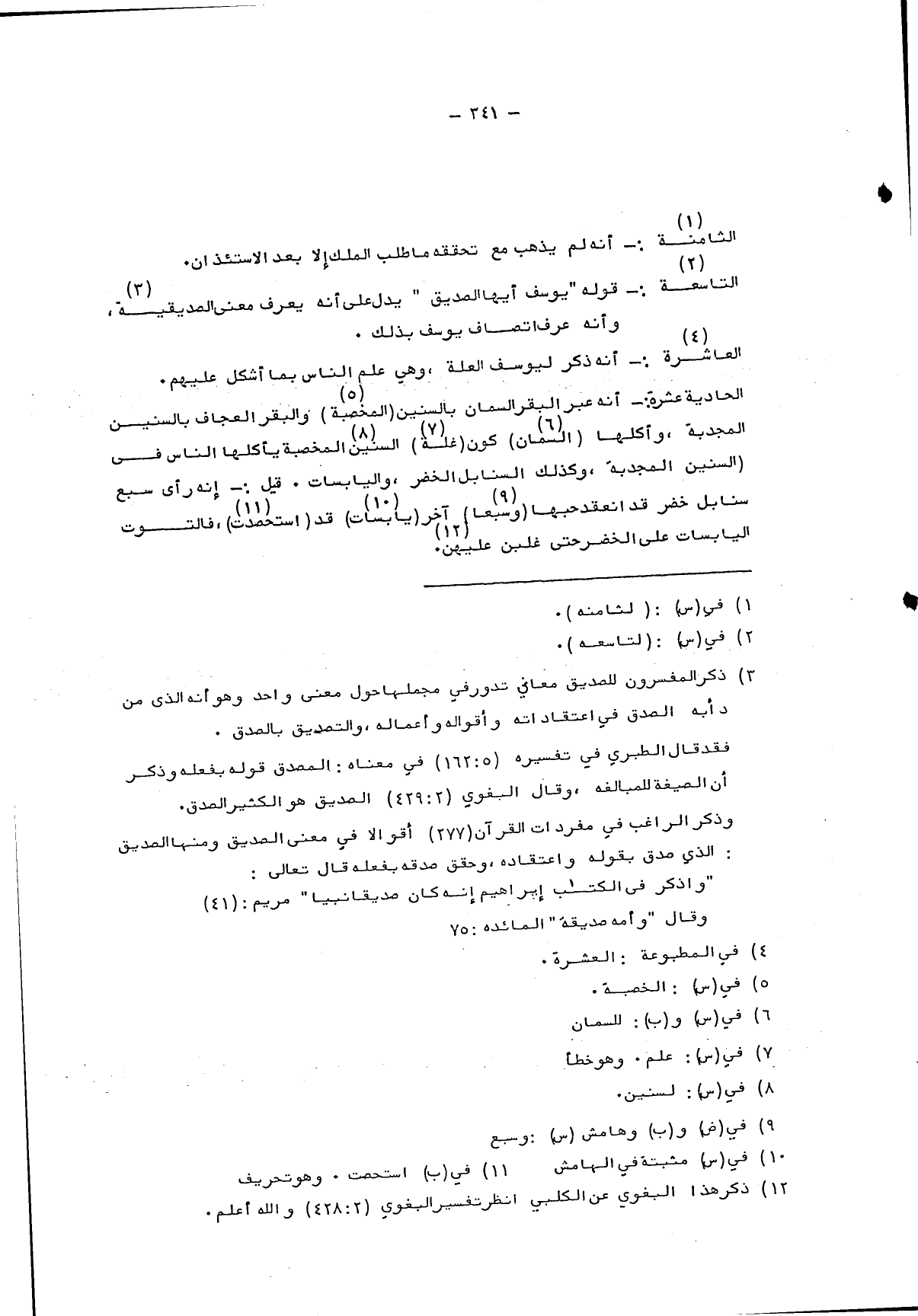 الحادية عشرة: أنه عبر البقر السمان بالسنين "المخصبة"5 والبقر العجاف بالسنين المجدبة، وأكلها "المسمان"6 كون "غله"7 السنين8 المخصبة يأكلها الناس في "السنين المجدبة، وكذلك السنابل الخفر، واليابسات. قيل: إنه رأى سبع سنابل خضر قد انعقد حبها "وسبعا"9 آخر "يابسات"10 قد "استحصدت"11، فالتوت اليابسات على الخضر حتى غلبن عليهن12.