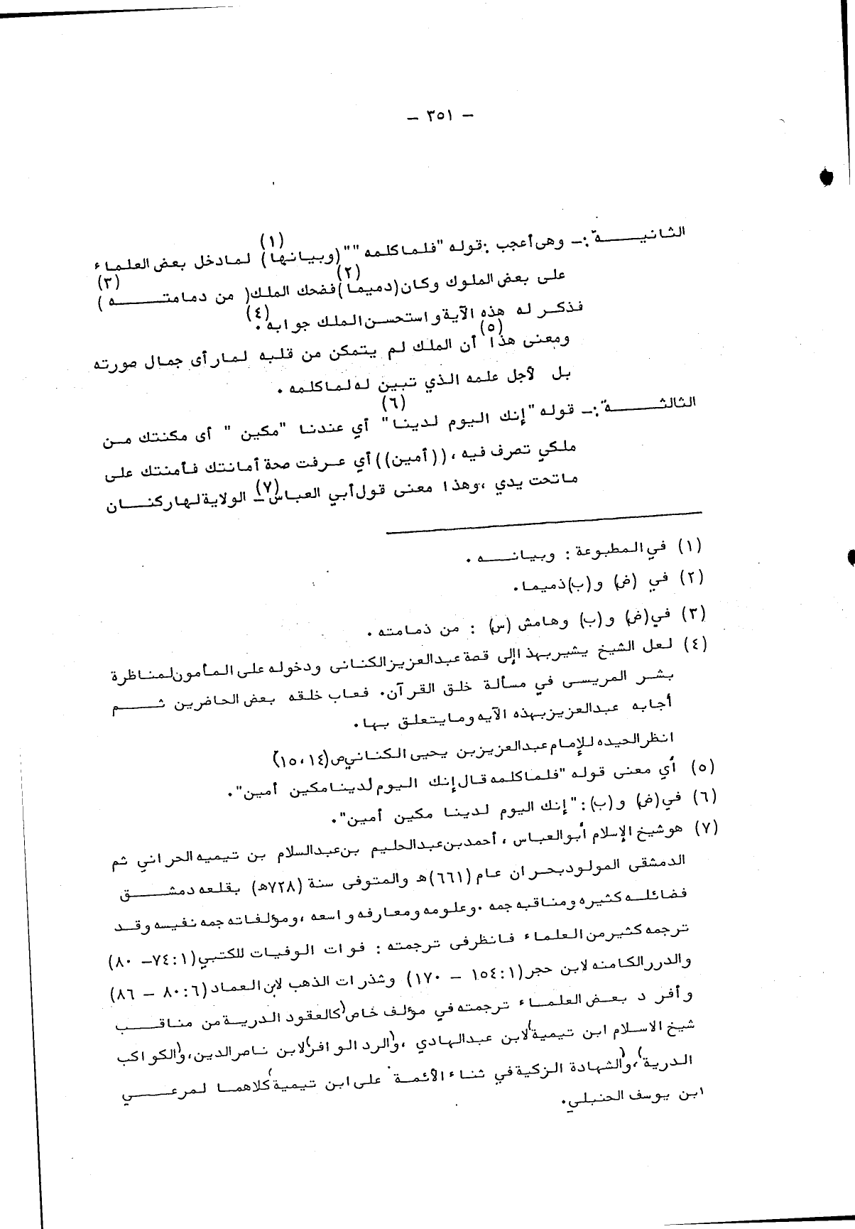 4 لعل الشيخ يشير بهذا إلى قصة عبد العزيز الكناني ودخوله على المأمون لمناظرة بشر المريسي في مسألة خلق القرآن. فعاب خلقه بعض الحاضرين تم أجابه عبد العزيز بهذه الآية وما يتعلق بها.