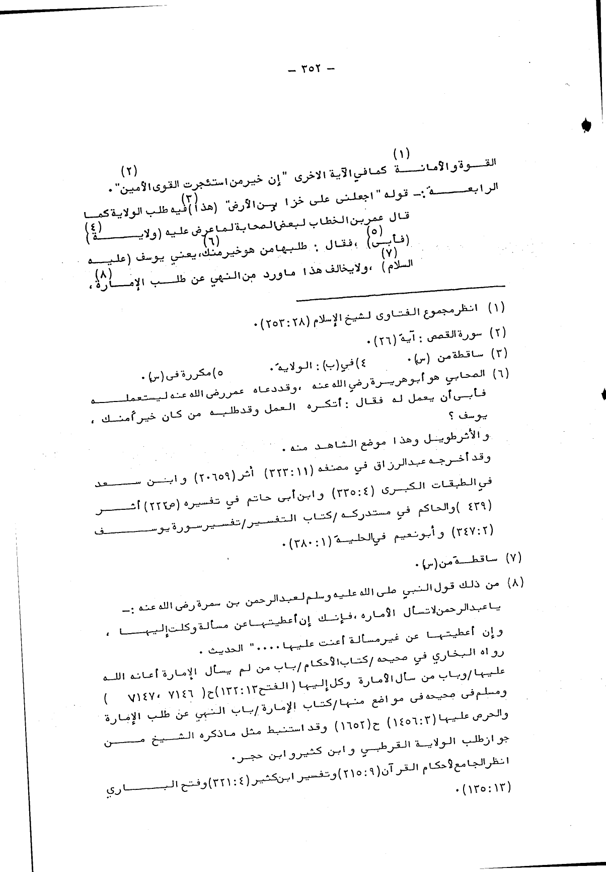 6 الصحابي هو أبو هريرة رضي الله عنه، وقد دعاه عمر رضي الله عنه ليستعمله فأبى أن يعمل له فقال: أتكره العمل وقد طلبه من كان خيراً منك، يوسف؟