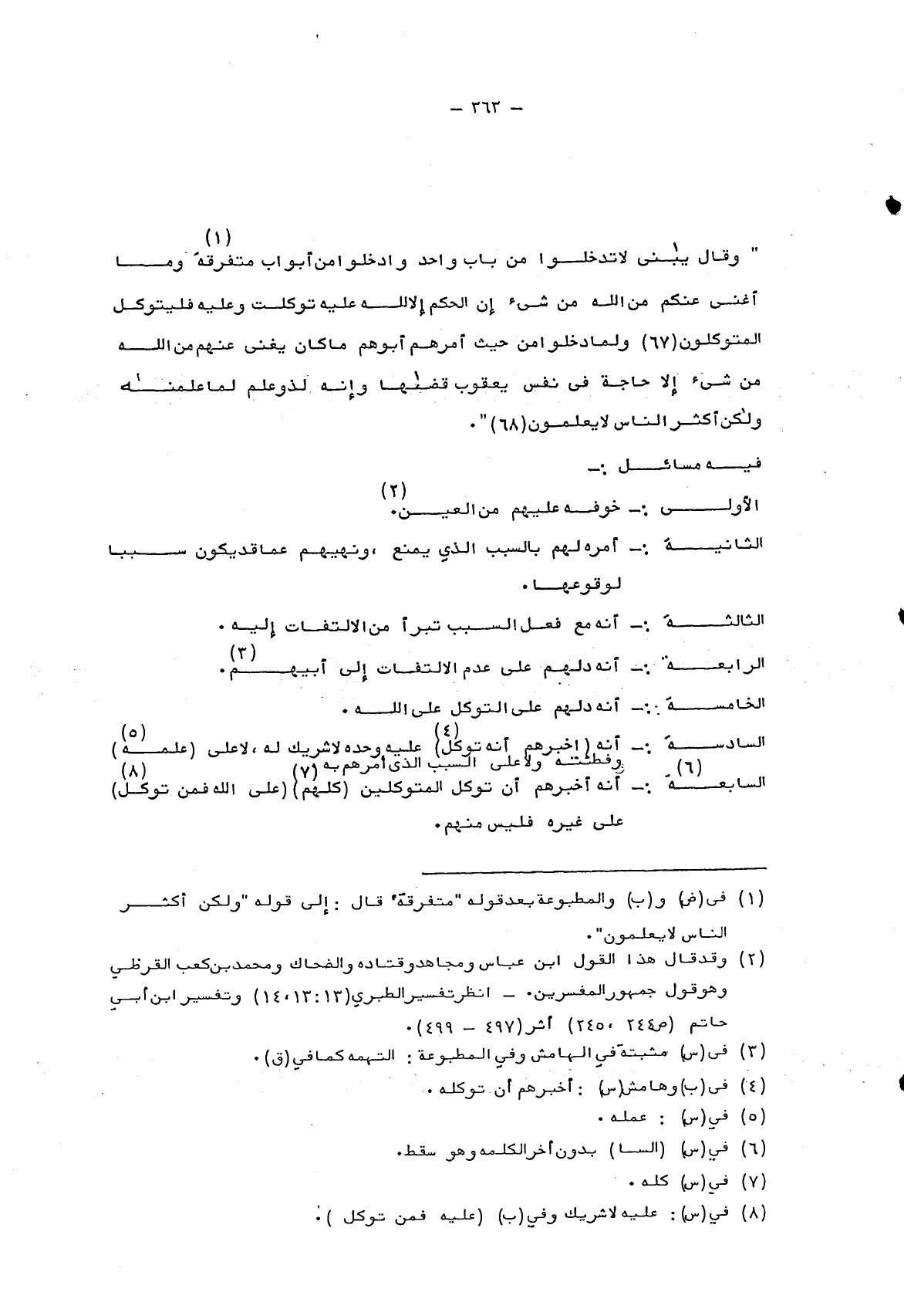 السادسة: أنه "أخبرهم أنه توكل"4 عليه وحده لا شريك له، لا على "علمه"5 وفطنته ولا على السبب الذي أمرهم به.