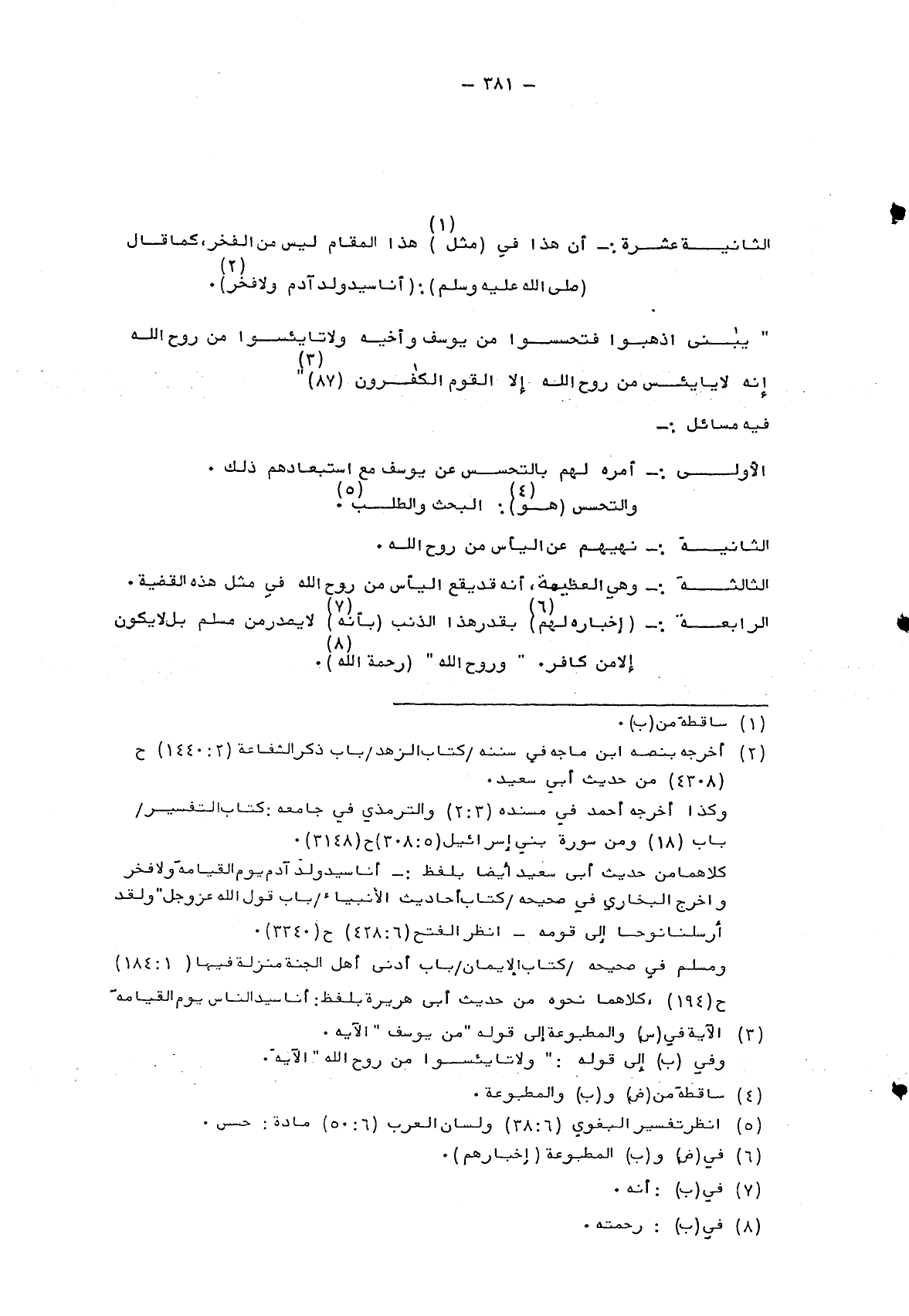 الرابعة: "إخباره لهم"6 بقدر هذا الذنب "بأنه"7 لا يصدر من مسلم بل لا يكون إلا من كافر. "وروح الله" "رحمة الله"8.