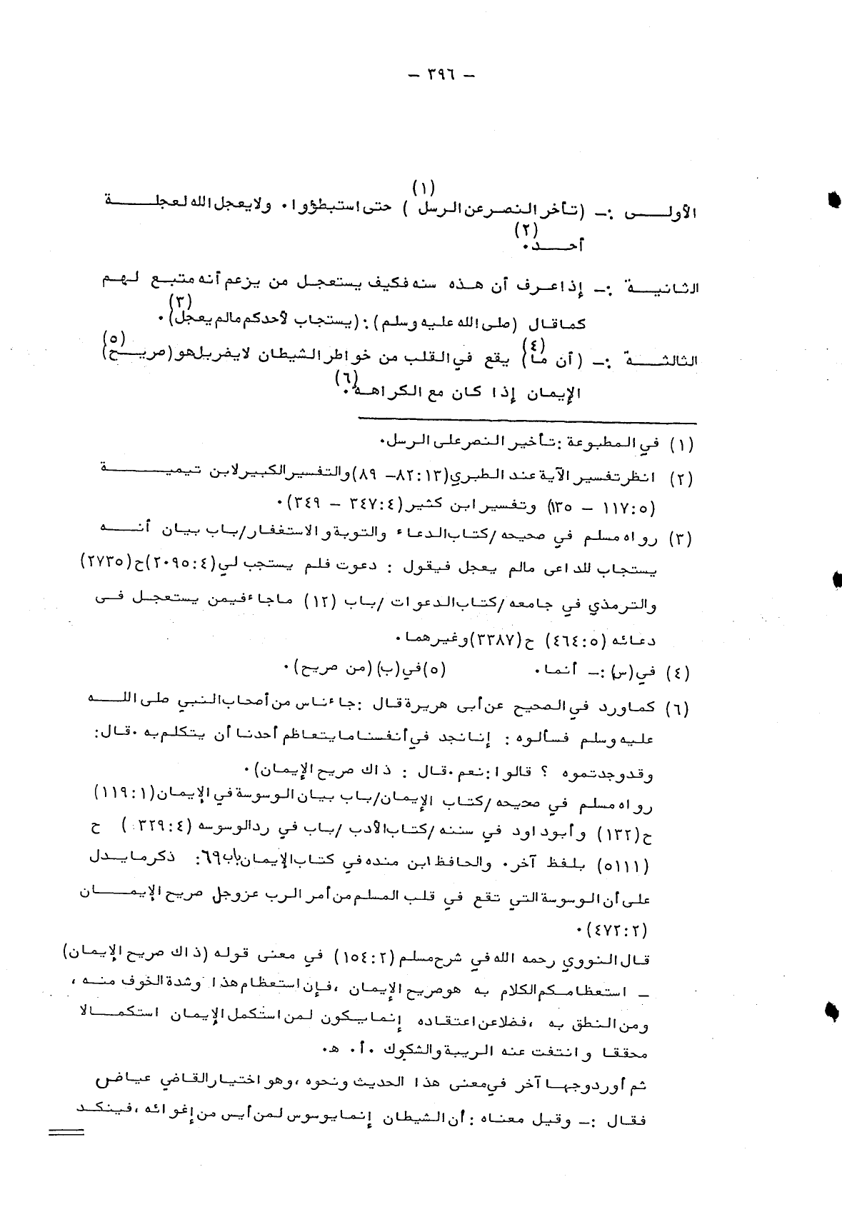 6 كما ورد في الصحيح عن أبي هريرة قال: جاء ناس من أصحاب النبي صلى الله عليه وسلم فسألوه: إنا نجد في أنفسنا ما يتعاظم أحدنا أن يتكلم به. قال: "وقد وجد تموه؟ ", قالوا: نعم. قال: "ذاك صريح الإيمان".