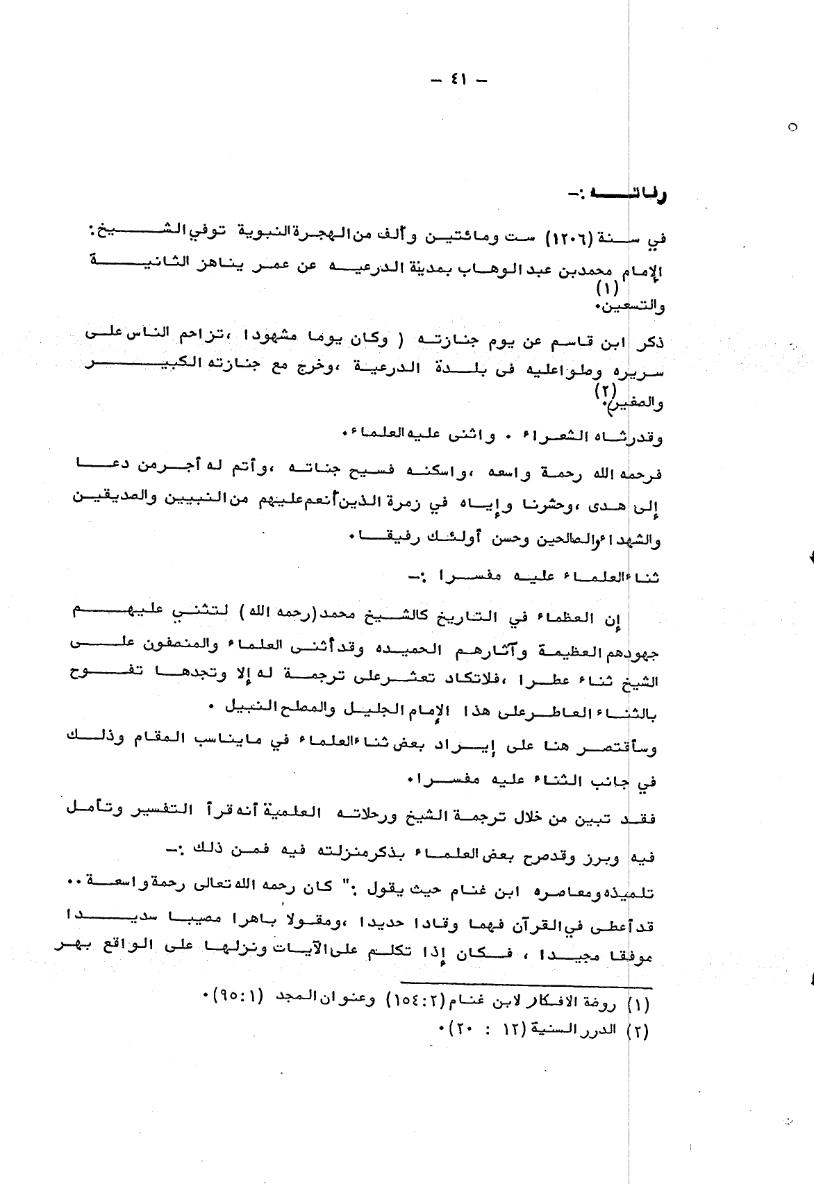 في سنة "1206" ست ومائتين وألف من الهجرة النبوية توفي الشيخ: الإمام محمد بن عبد الوهاب بمدينة الدرعية عن عمر يناهز الثانية والتسعين1.